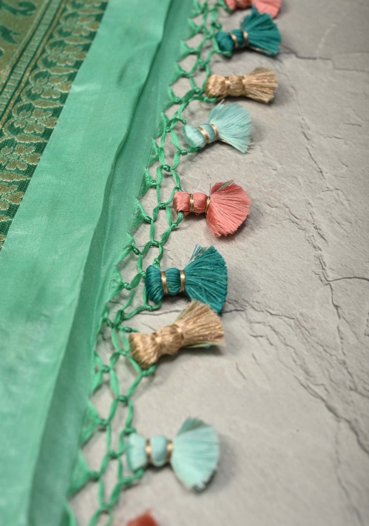 This saree is ready to wear with fall and pico done. Handmade silk tassels adorn the pallu and add more grace to it. An unstitched blouse fabric is included.