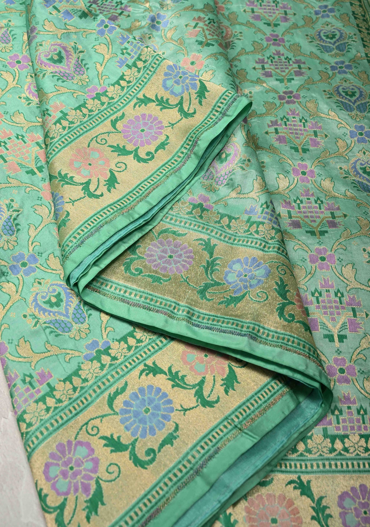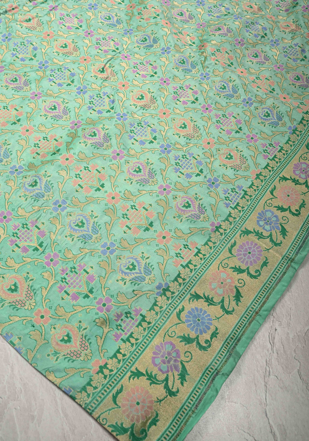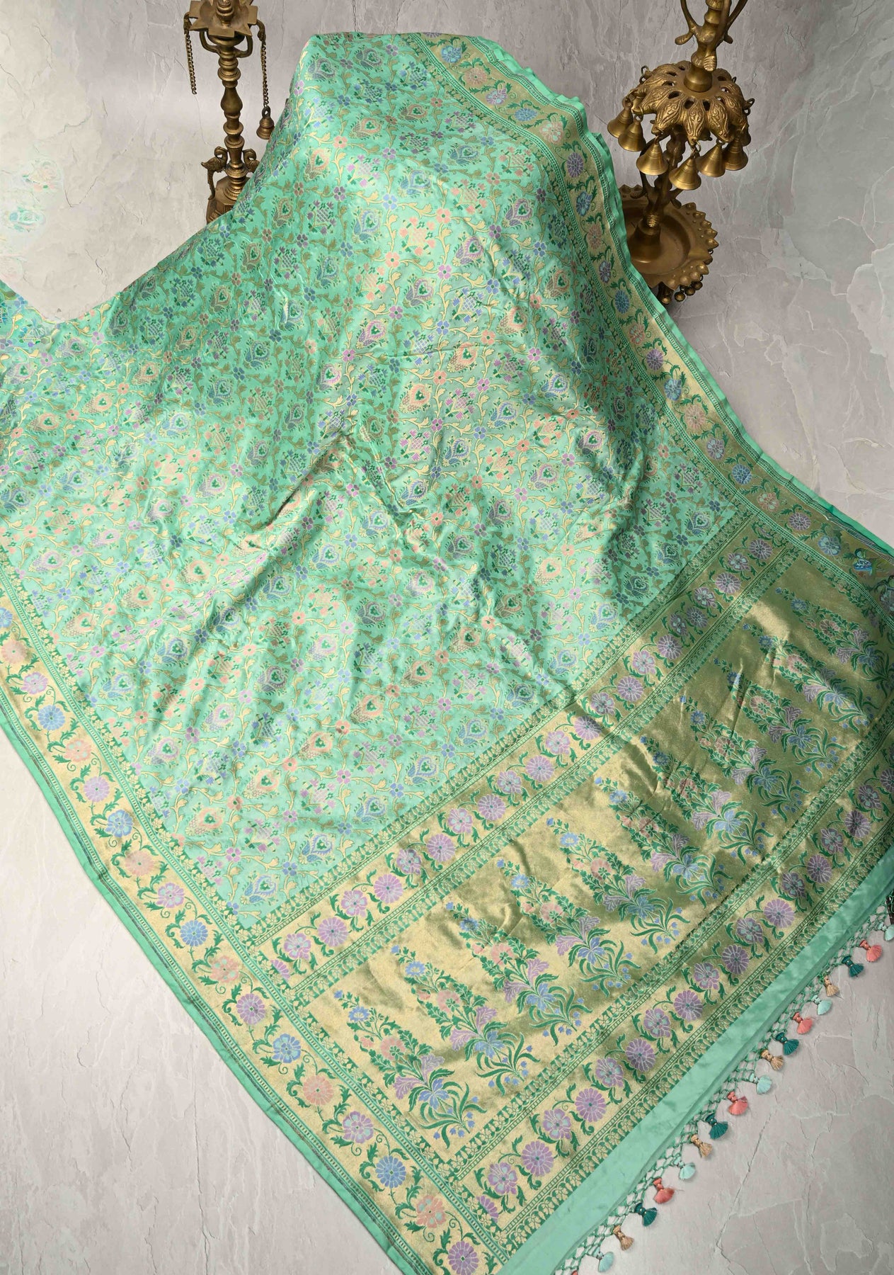 This exquisite Aqua Green Banarasi Katan Silk Saree is a vibrant showcase of heritage weaving and refined elegance. The body is adorned with an intricate Meenakari Patola brocade jaal, featuring multicolored motifs woven with exceptional detail and finesse. Crafted from Katan silk, the saree has a lustrous finish and a smooth, luxurious drape. A finely woven zari border frames the saree, adding a regal touch to its traditional charm. Perfect for weddings, festive occasions, and grand celebrations, this saree is a statement piece that blends the grandeur of Banarasi artistry with the brilliance of Patola-inspired designs.