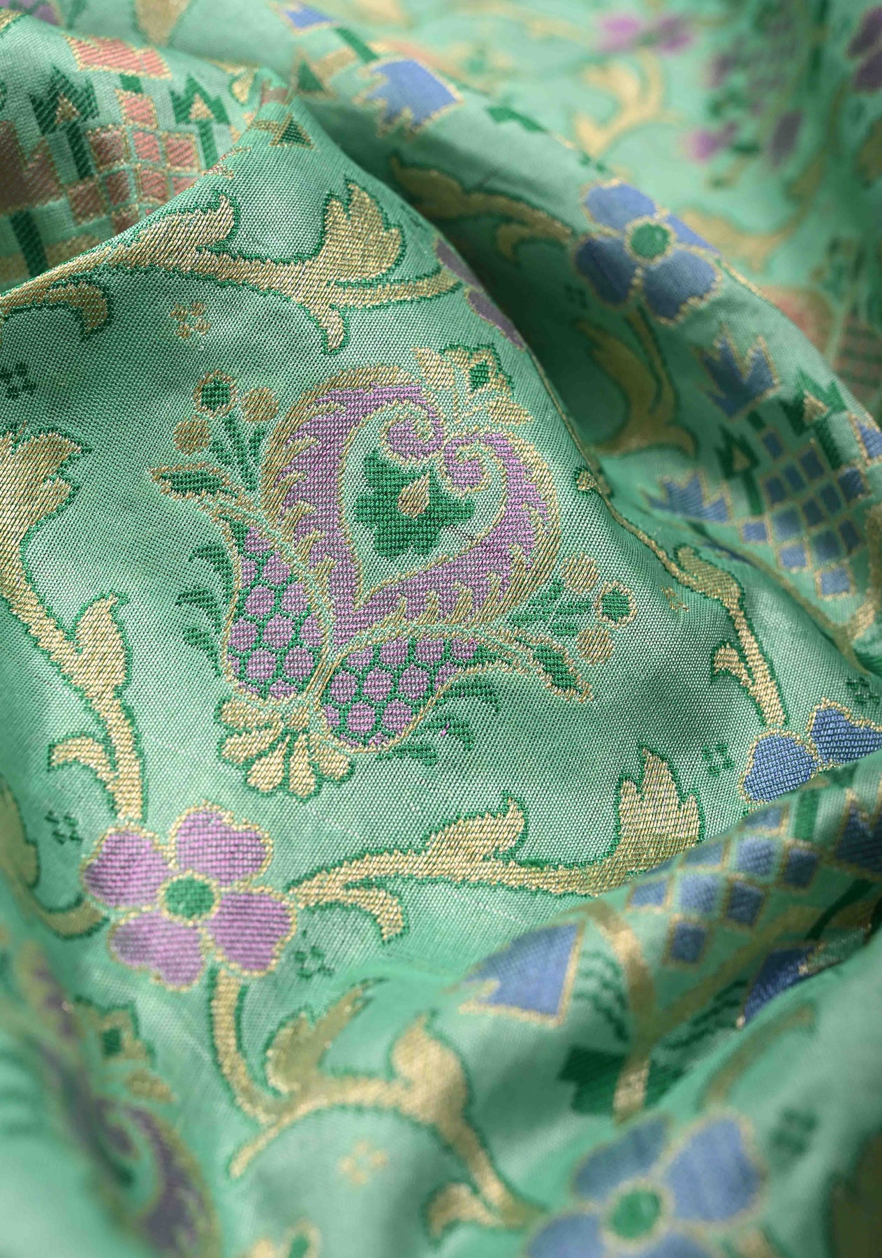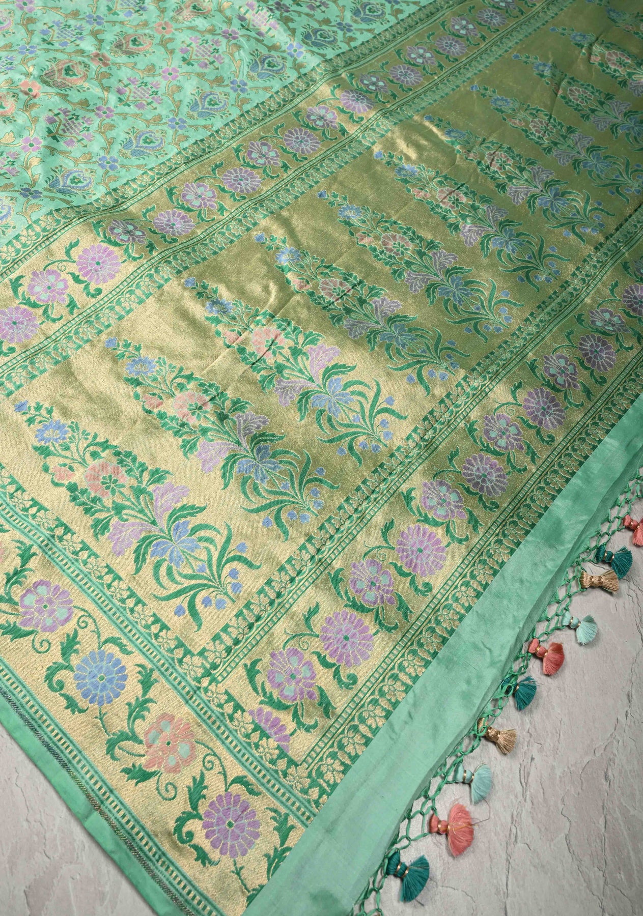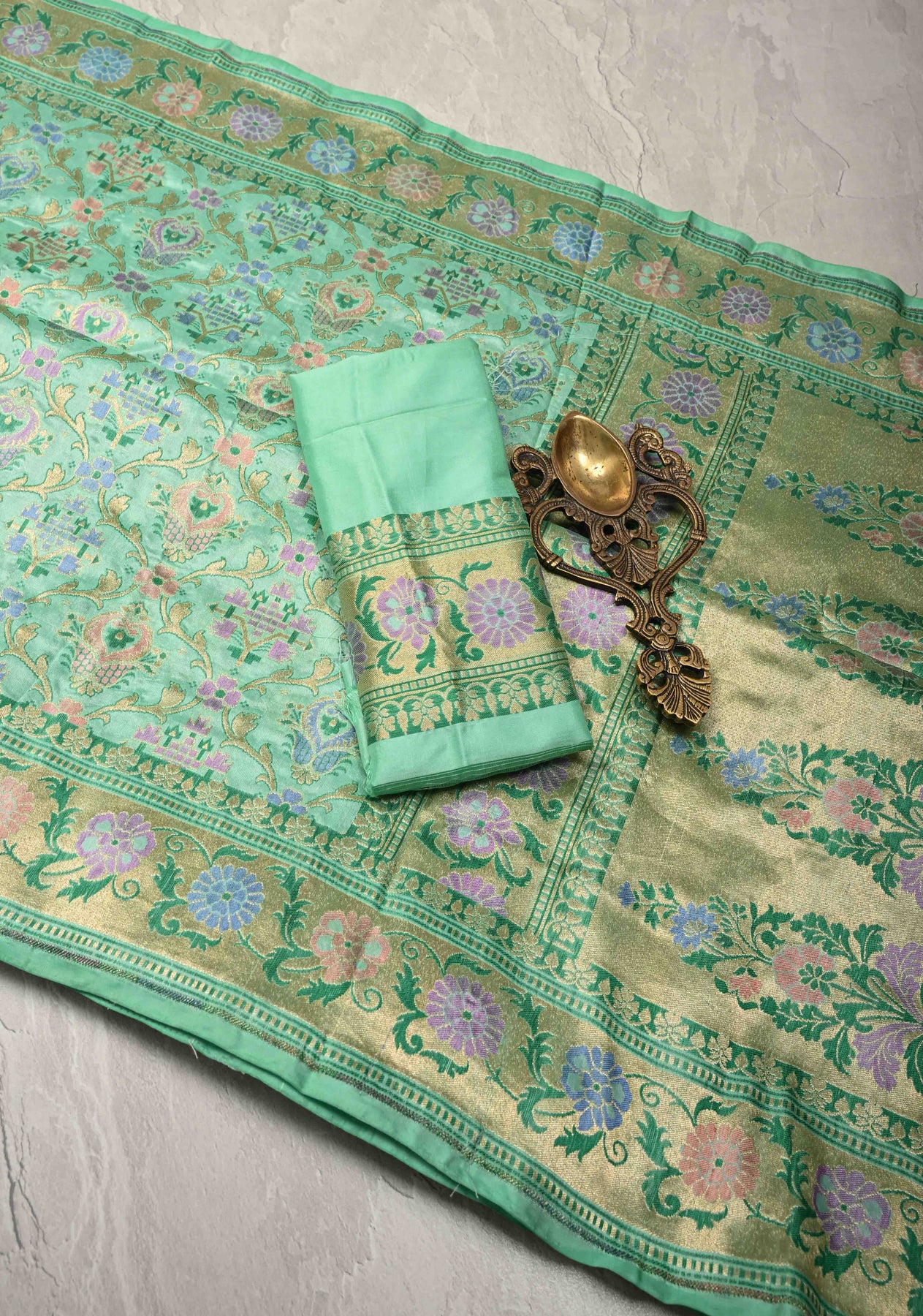 This exquisite Aqua Green Banarasi Katan Silk Saree is a vibrant showcase of heritage weaving and refined elegance. The body is adorned with an intricate Meenakari Patola brocade jaal, featuring multicolored motifs woven with exceptional detail and finesse. Crafted from Katan silk, the saree has a lustrous finish and a smooth, luxurious drape. A finely woven zari border frames the saree, adding a regal touch to its traditional charm. Perfect for weddings, festive occasions, and grand celebrations, this saree is a statement piece that blends the grandeur of Banarasi artistry with the brilliance of Patola-inspired designs.