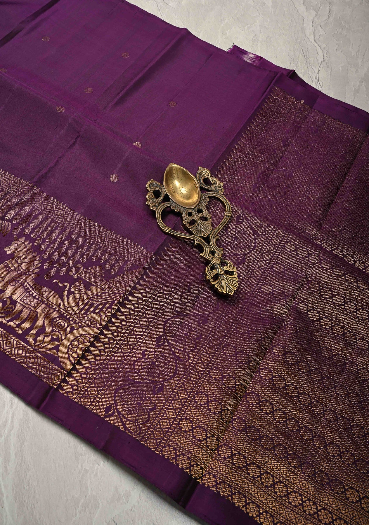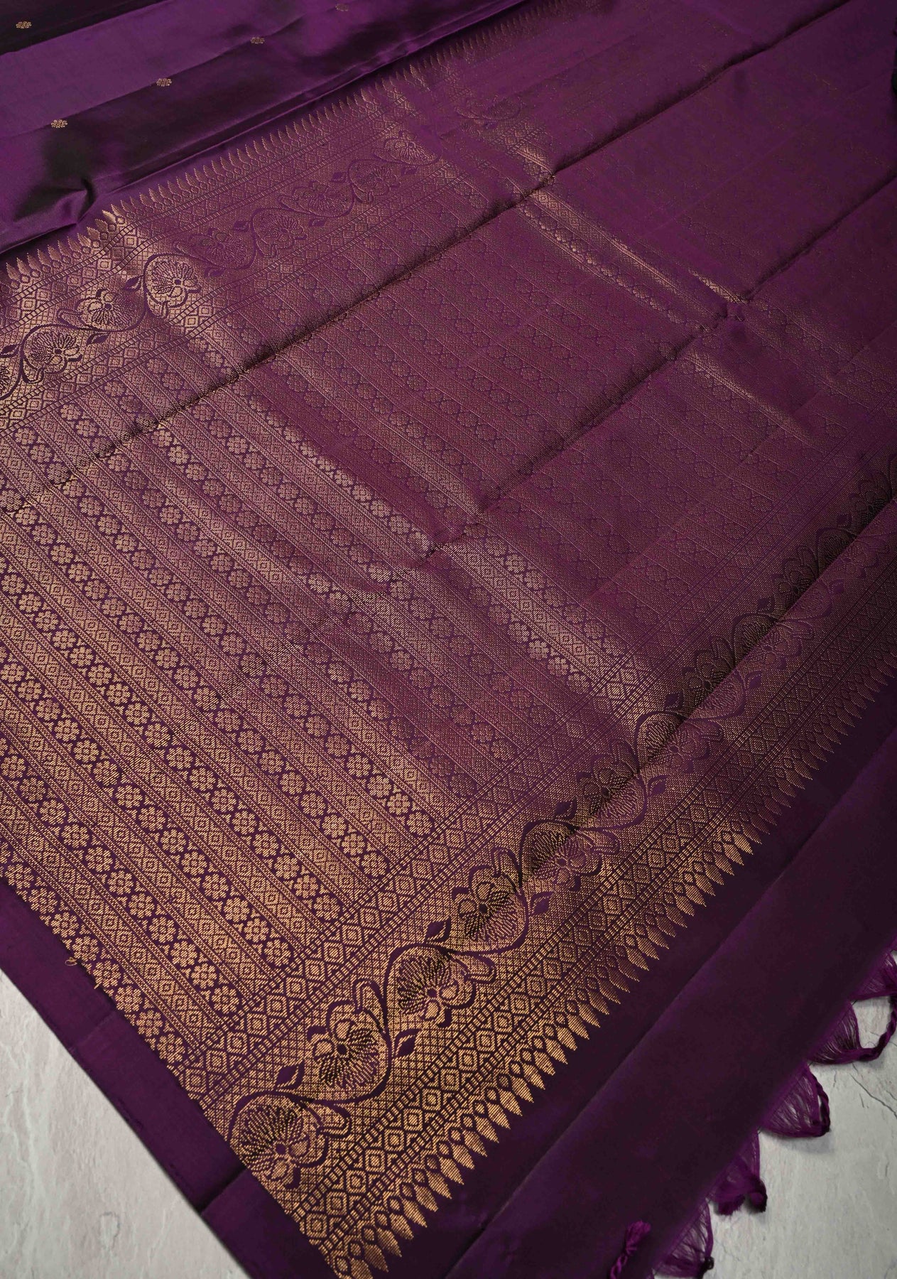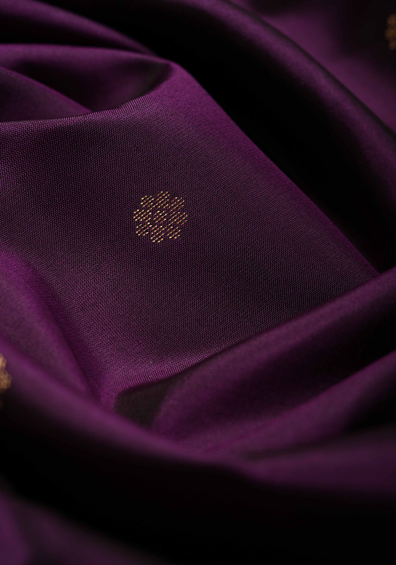 The Eggplant Purple Kanjivaram Soft Silk Saree with Zari Buttas and Zari Border is a rich and regal drape that celebrates the timeless beauty of traditional South Indian weaving. Crafted from luxurious soft silk, this saree features a deep eggplant purple hue that exudes elegance and sophistication. The body is adorned with delicate zari buttas, adding subtle shimmer and texture, while the finely woven zari border enhances the saree’s grandeur with its intricate detailing. Perfect for weddings, festive occasions, and cultural celebrations, this saree is a classic piece that combines refined color with exquisite craftsmanship, making it a must-have for any special wardrobe.