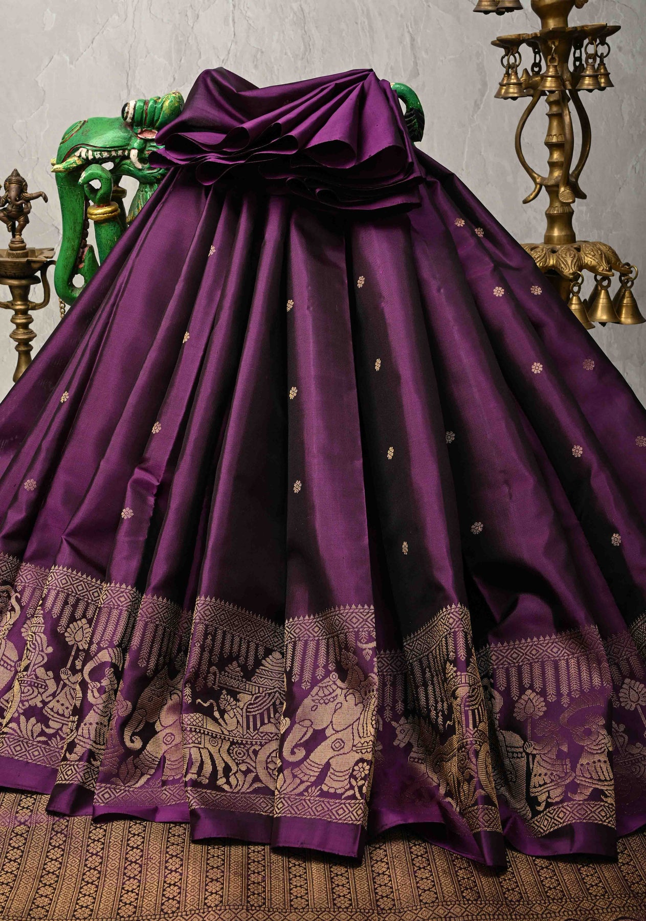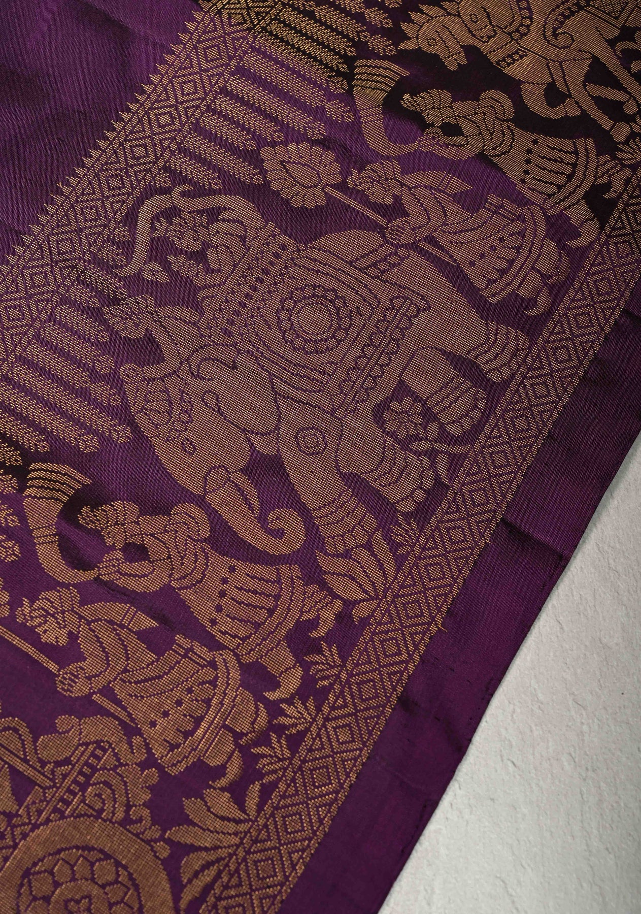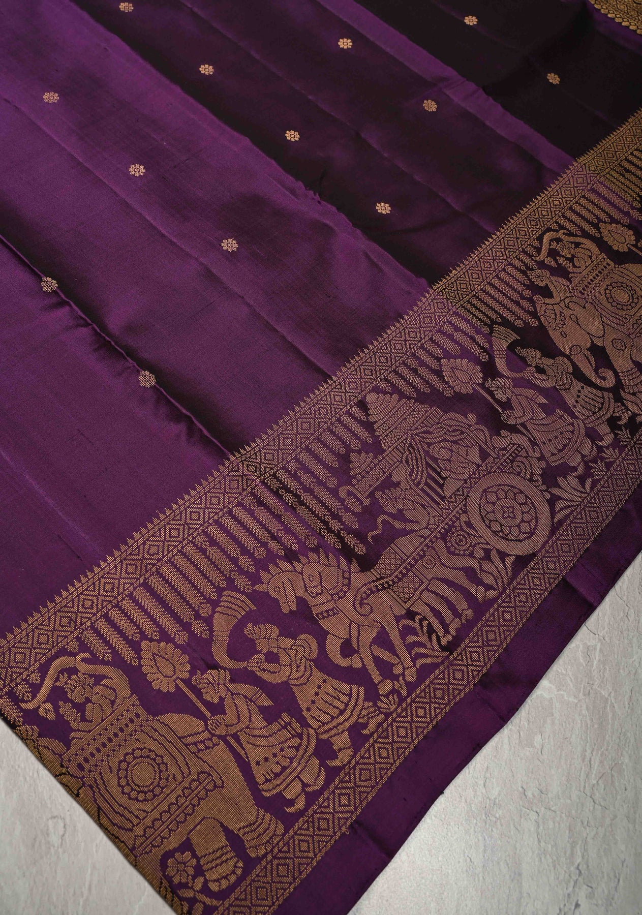The Eggplant Purple Kanjivaram Soft Silk Saree with Zari Buttas and Zari Border is a rich and regal drape that celebrates the timeless beauty of traditional South Indian weaving. Crafted from luxurious soft silk, this saree features a deep eggplant purple hue that exudes elegance and sophistication. The body is adorned with delicate zari buttas, adding subtle shimmer and texture, while the finely woven zari border enhances the saree’s grandeur with its intricate detailing. Perfect for weddings, festive occasions, and cultural celebrations, this saree is a classic piece that combines refined color with exquisite craftsmanship, making it a must-have for any special wardrobe.