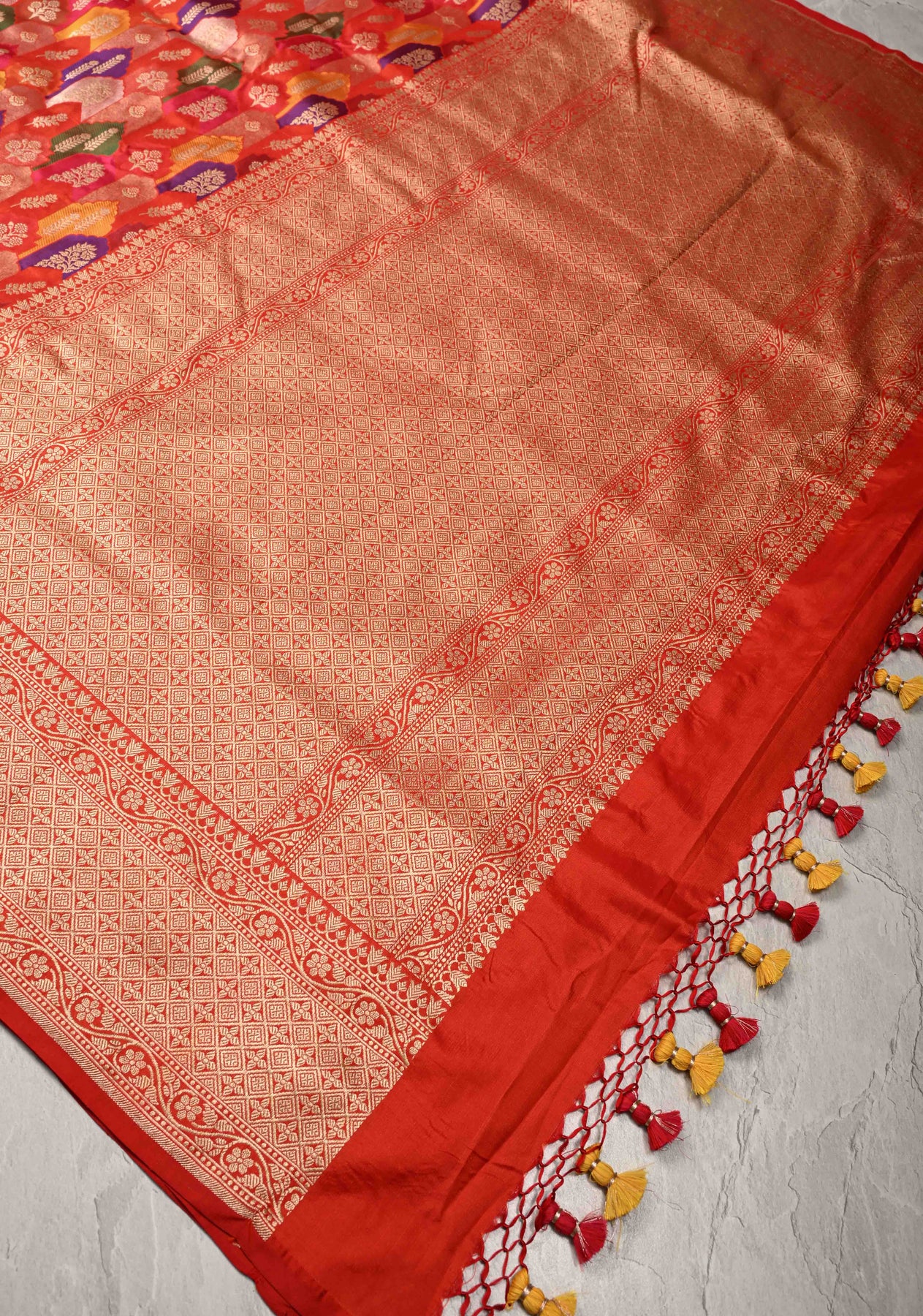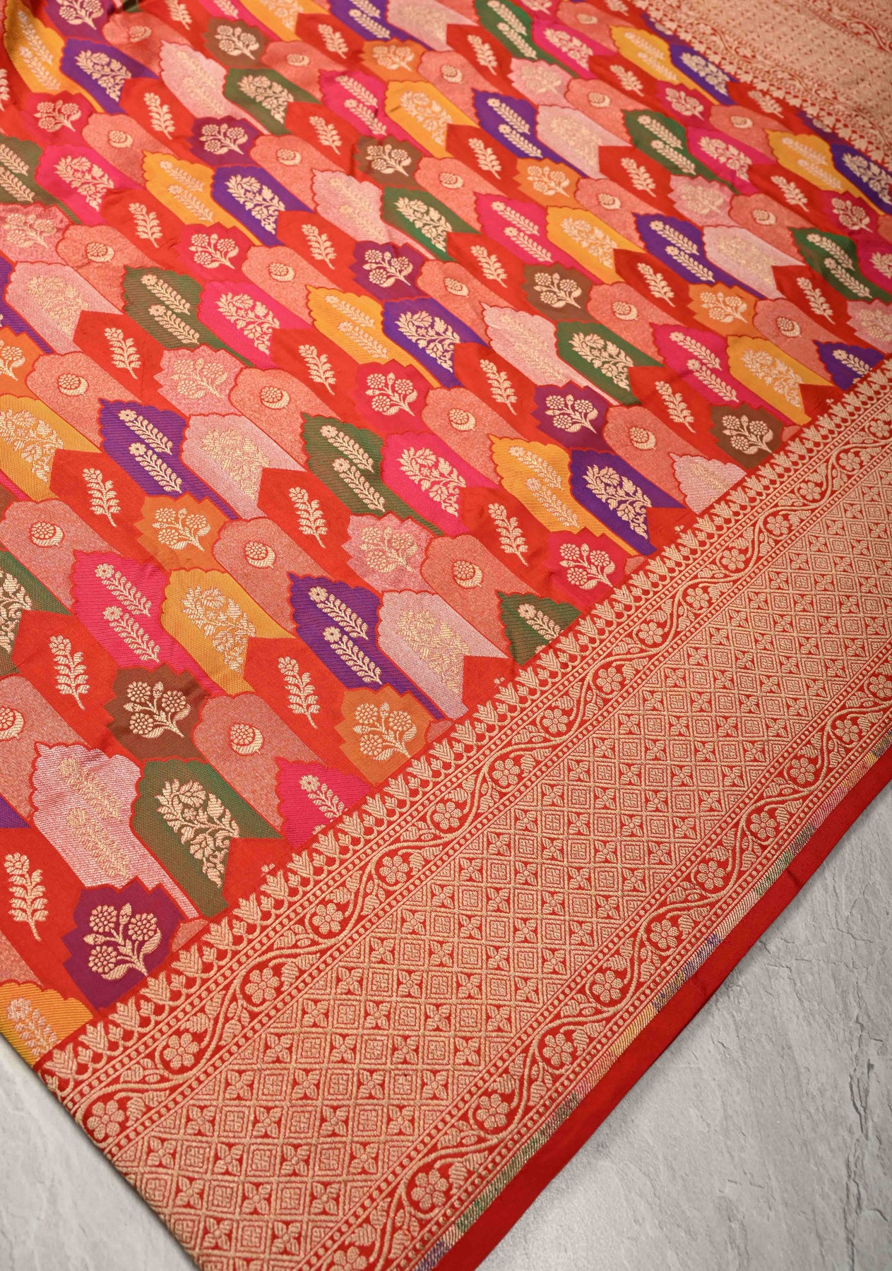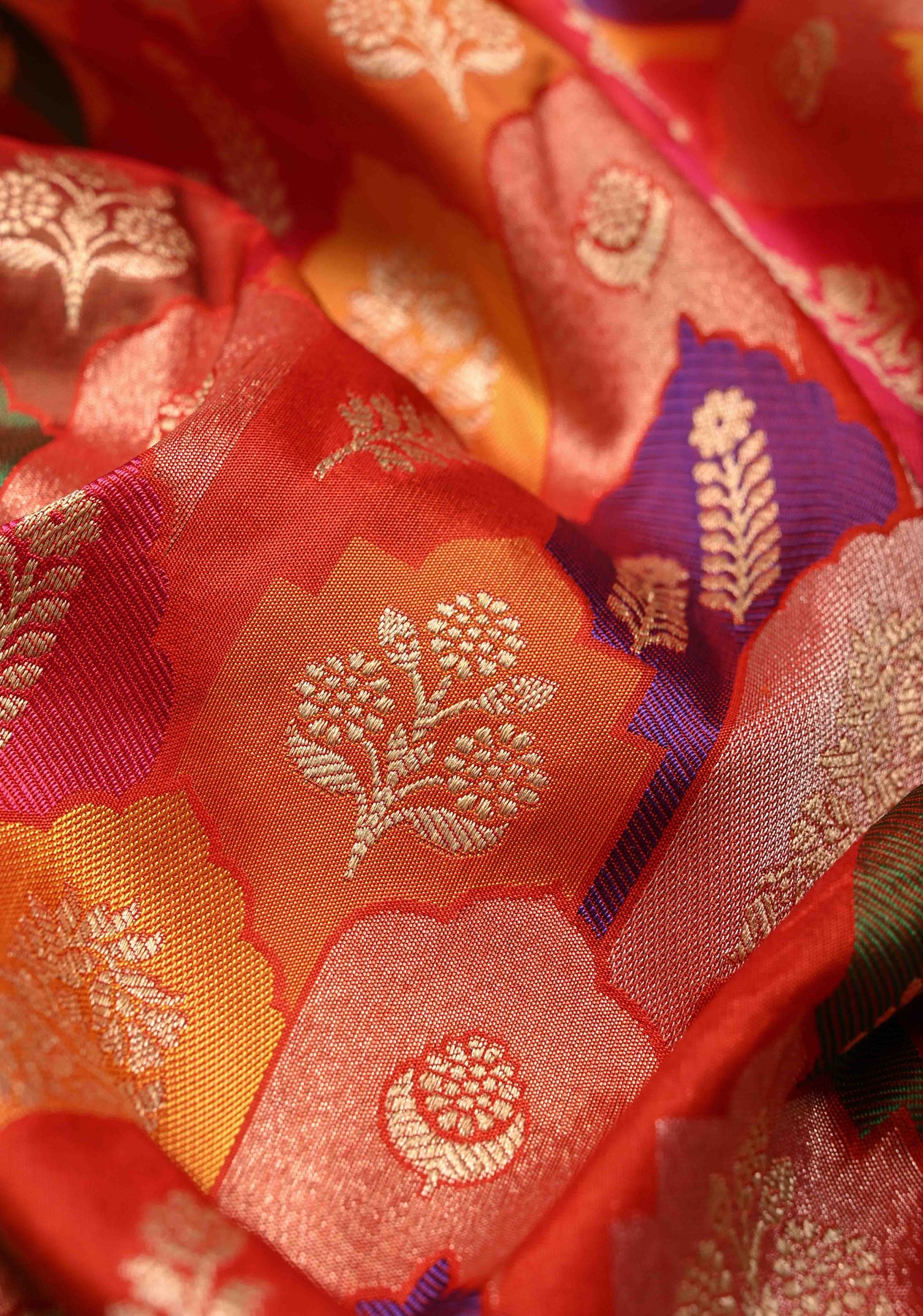 Multicolor Rangkaat Style Banarasi Katan Silk Saree and Geometric Brocade and Zari Border | SILK MARK CERTIFIED