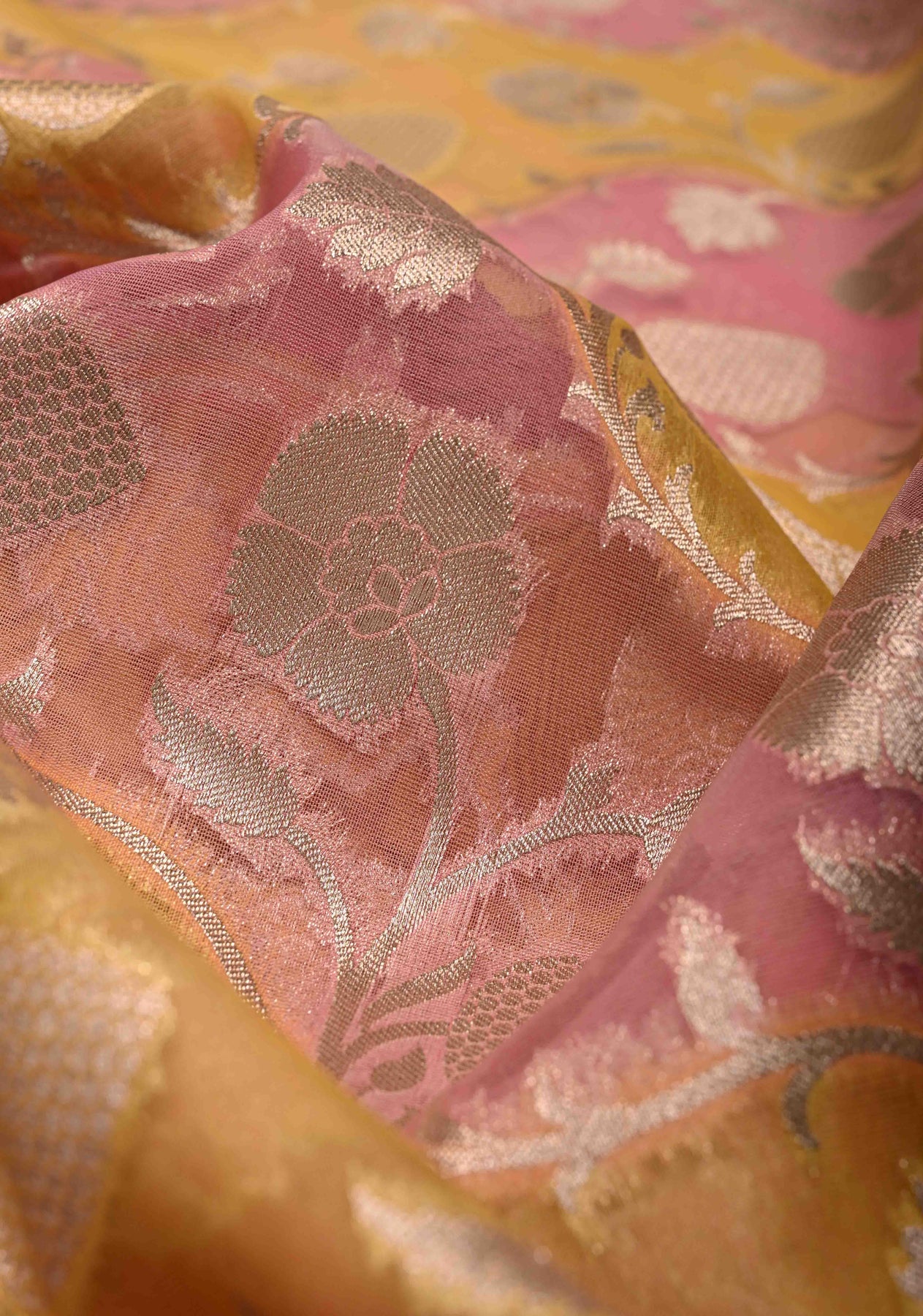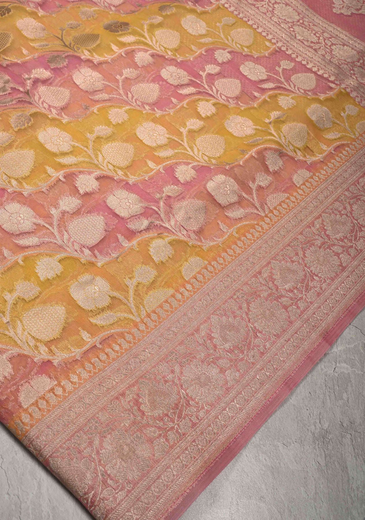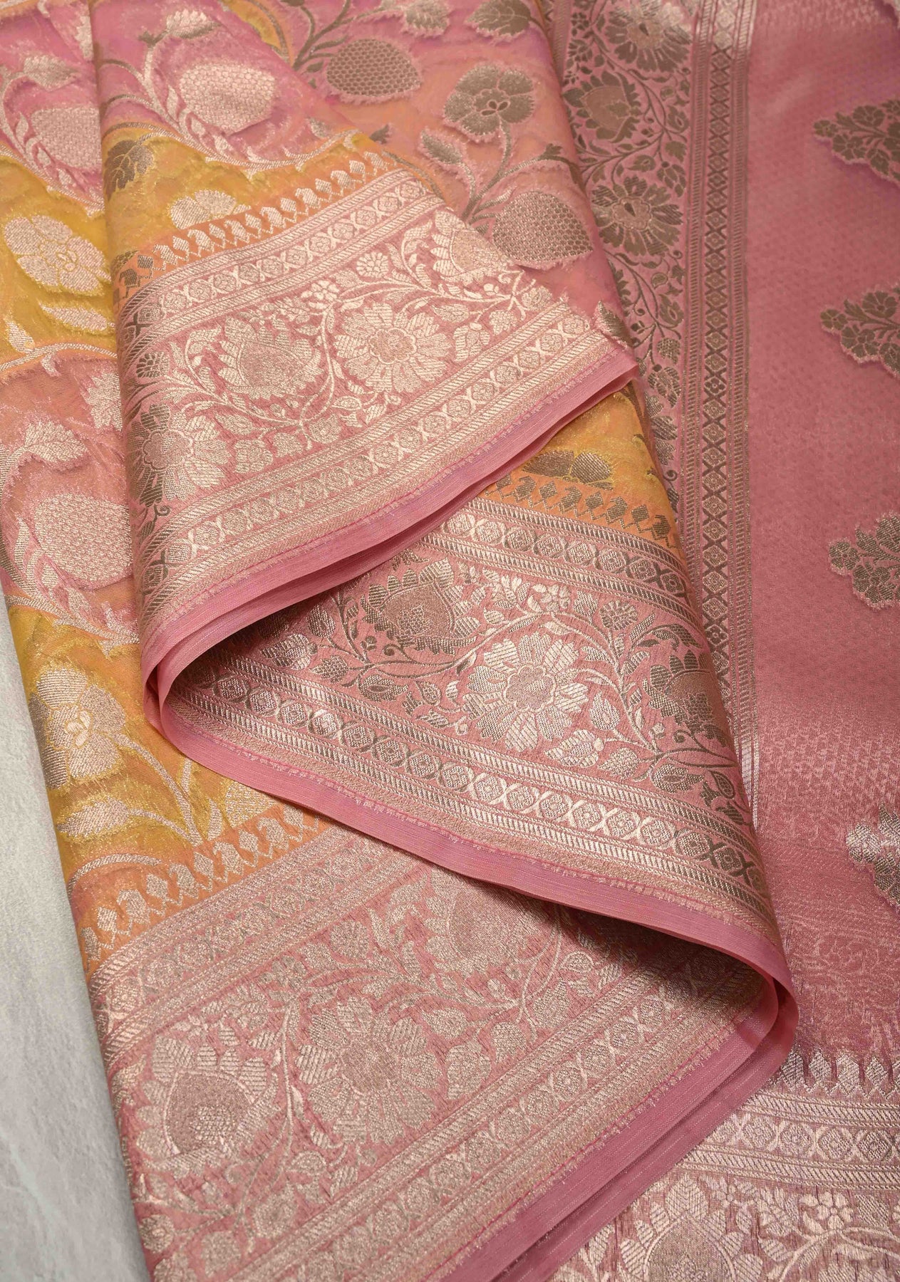 Dusty Pink-Yellow Leheria Pattern on Banarasi Semi Kora Saree with Floral Jaal and Zari Border
