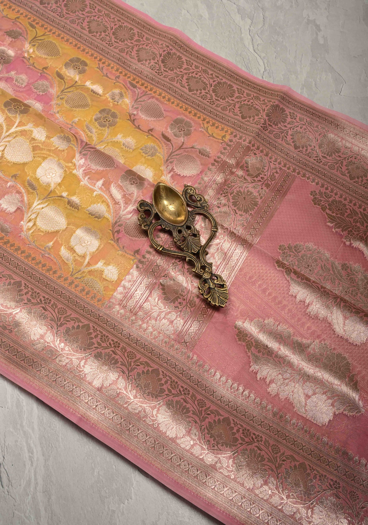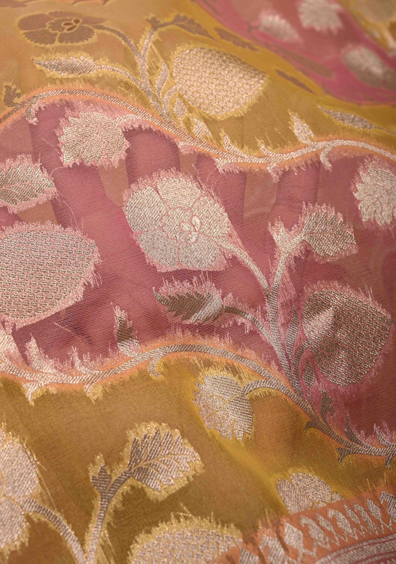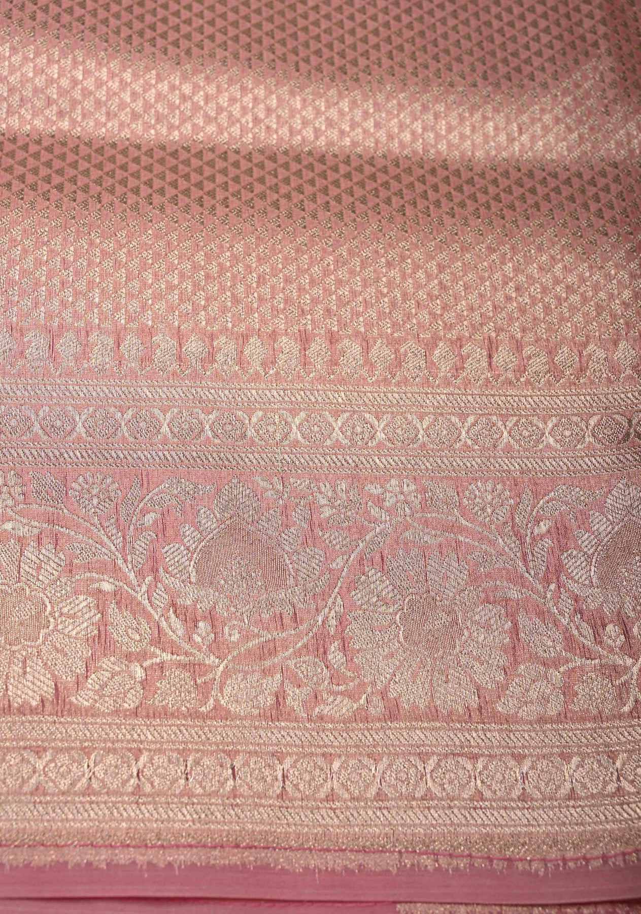 Dusty Pink-Yellow Leheria Pattern on Banarasi Semi Kora Saree with Floral Jaal and Zari Border