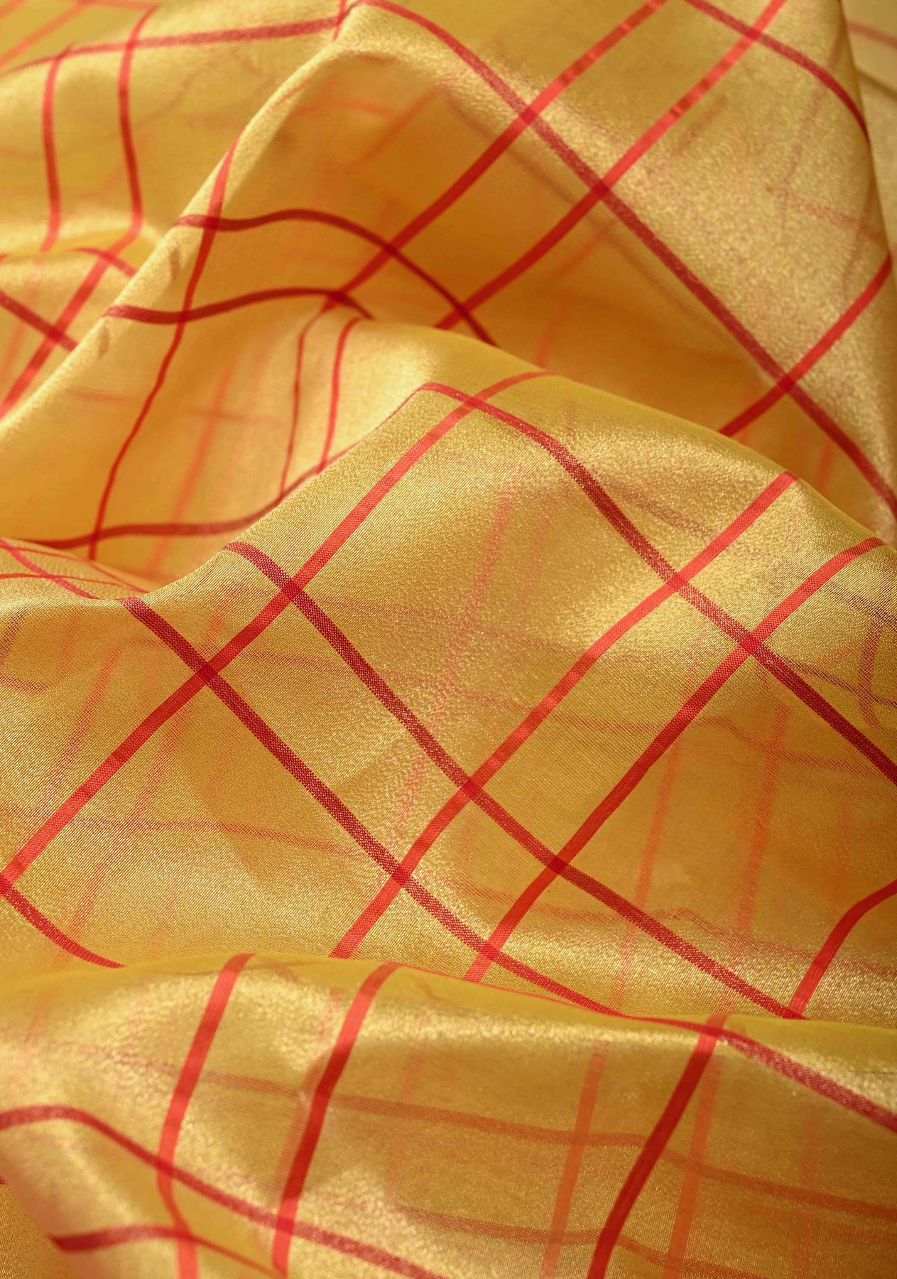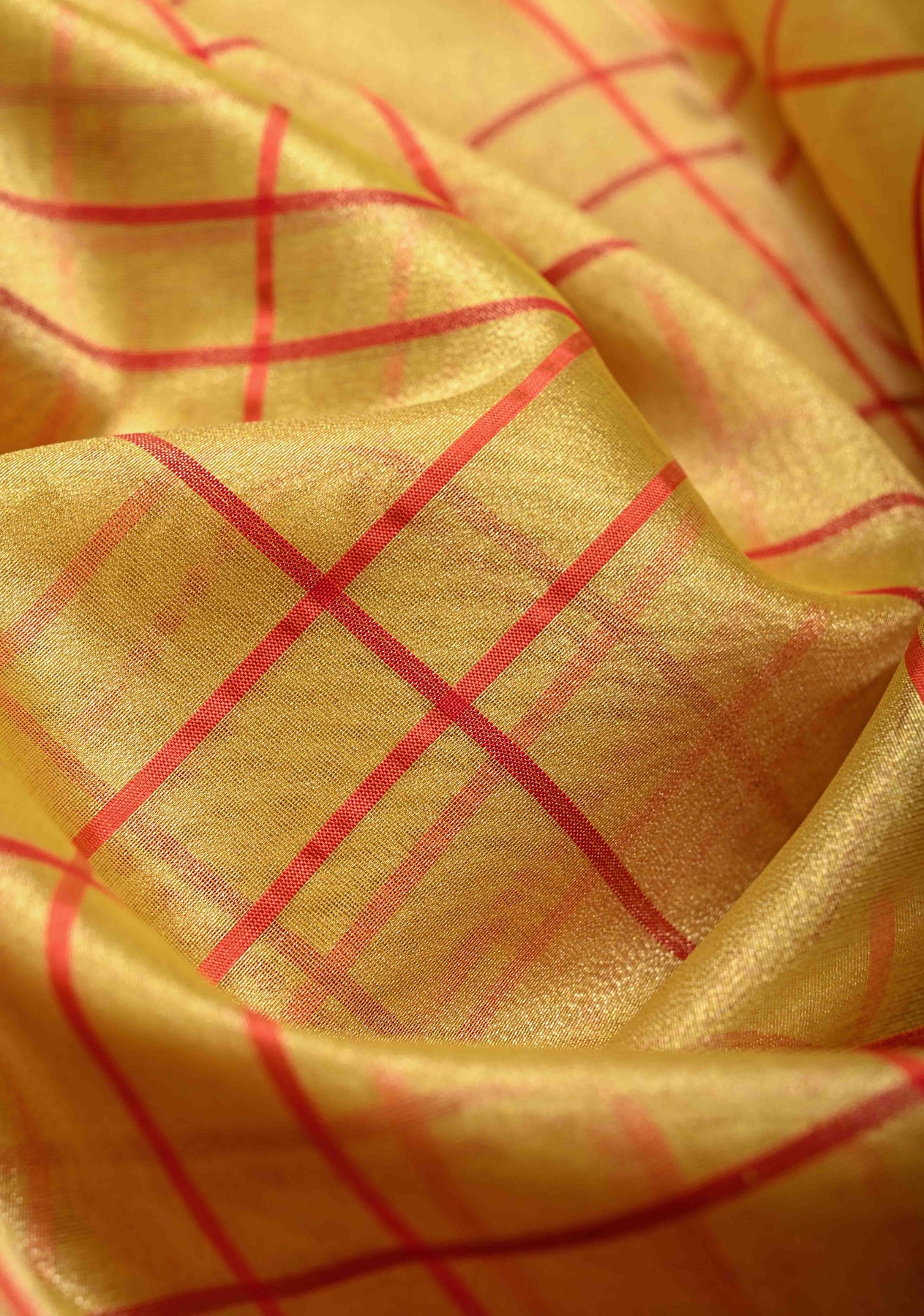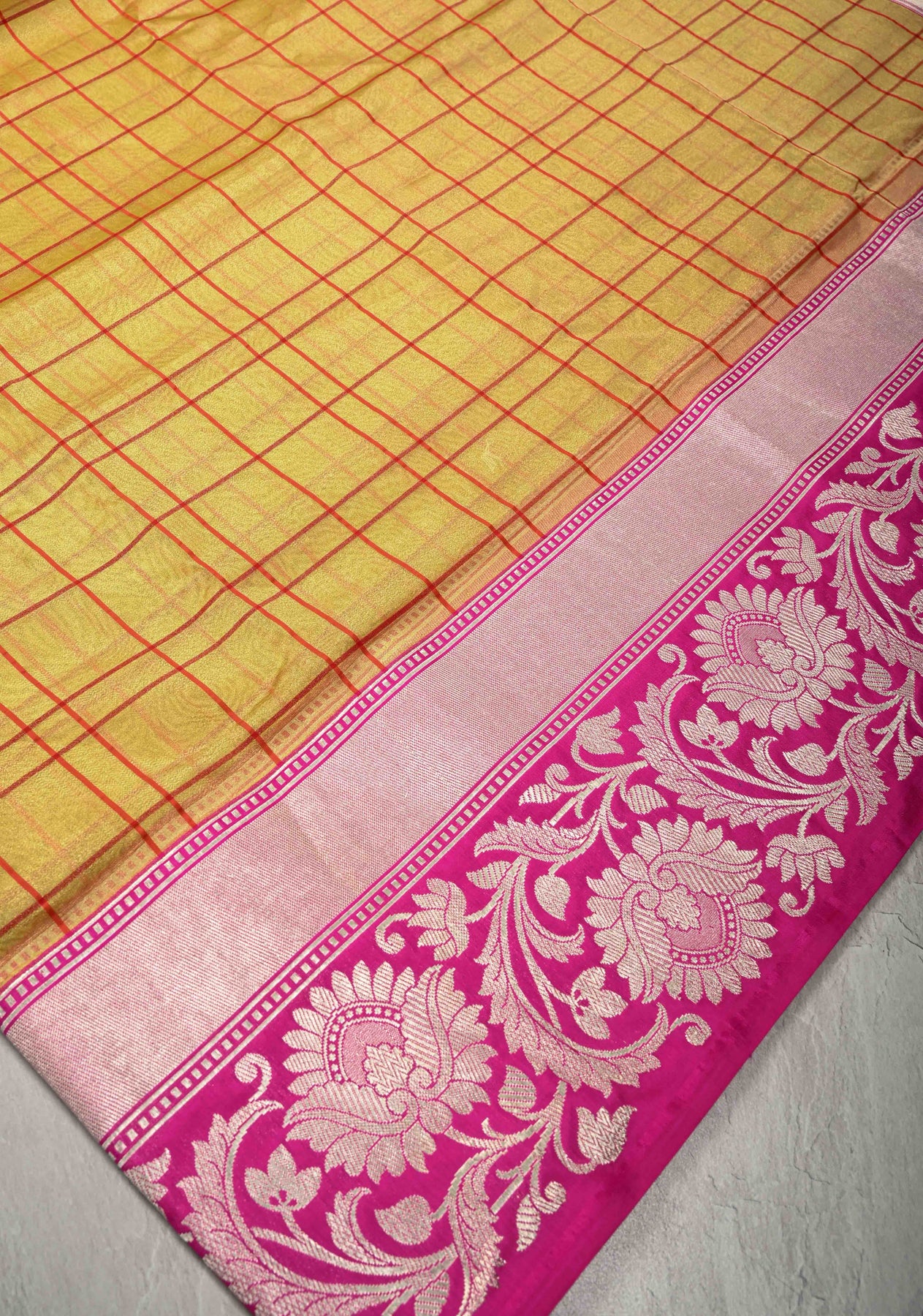 Gold Banarasi Kora Silk Saree with Checks Patter and Contrst Zari Border | SILK MARK CERTIFIED