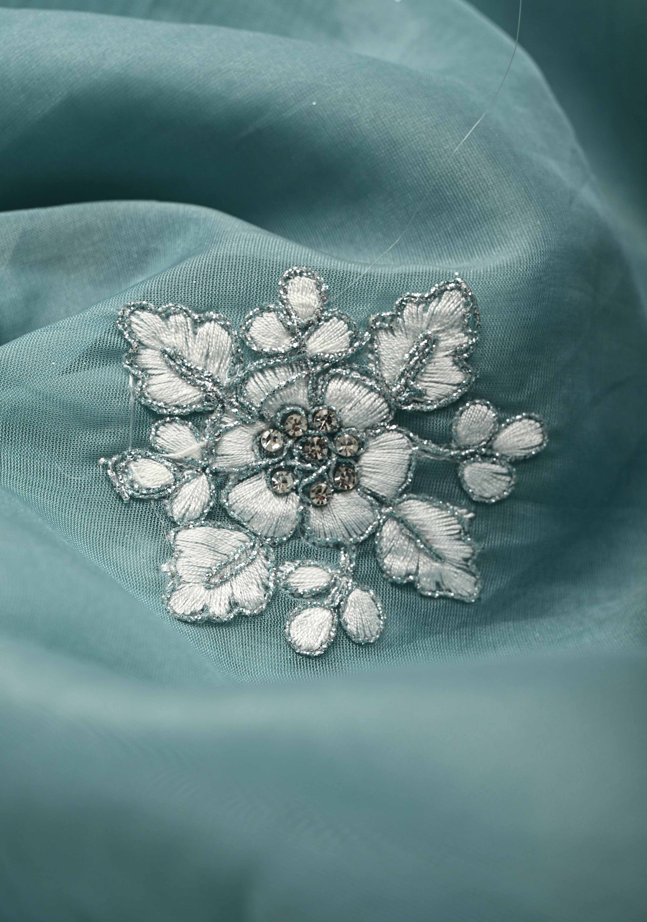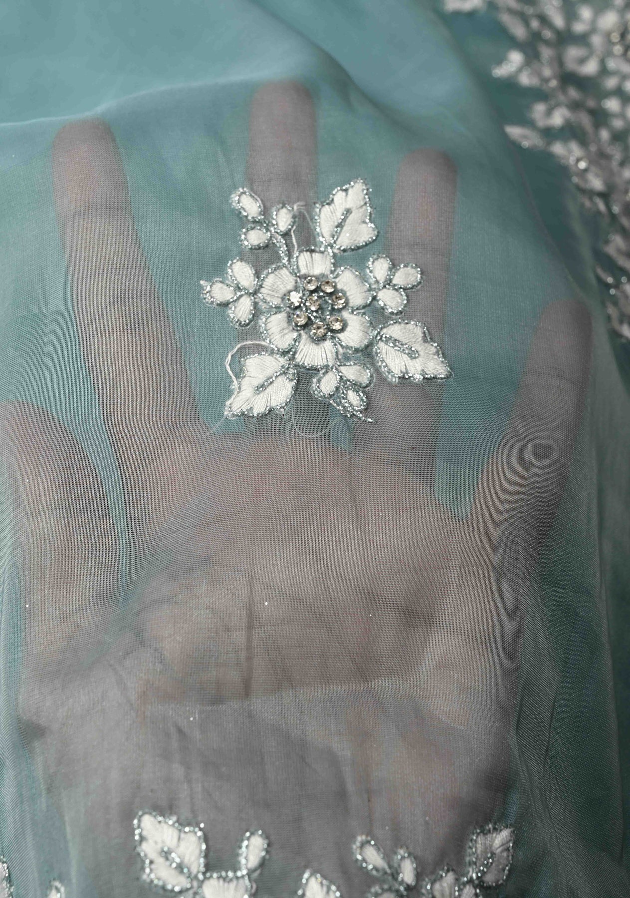 Elevate your festive wardrobe with this ethereal Pantone Green Organza Saree, delicately crafted for modern elegance. The sheer organza fabric drapes with airy grace, while fine machine embroidery adds intricate detailing across the body. Sparkling stone work enhances the embroidery with a touch of shimmer, perfect for evening events and celebrations. Finished with a beautifully feminine scallop border, this saree strikes the ideal balance between subtle glamour and timeless style. Pair it with a contrast blouse and minimal jewelry for a fresh, contemporary ethnic look.