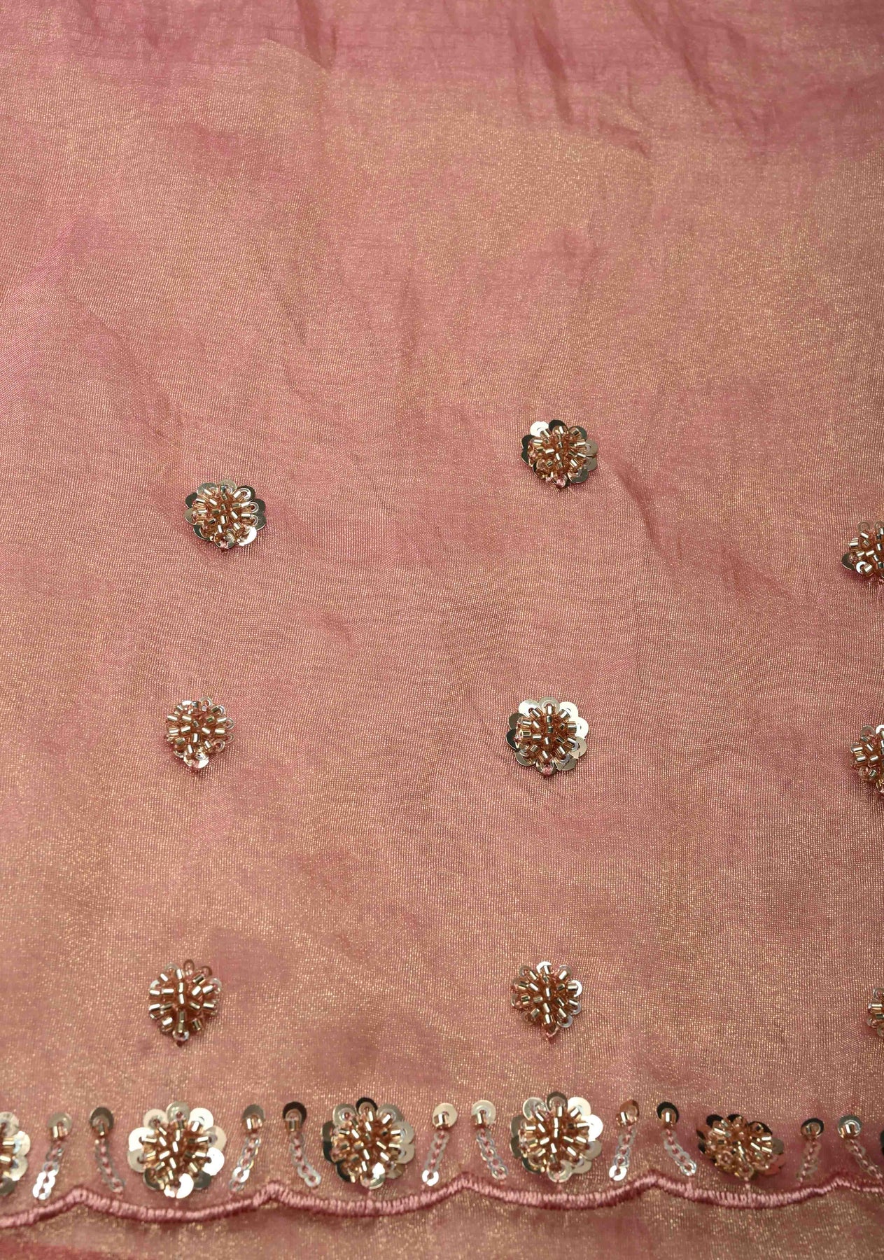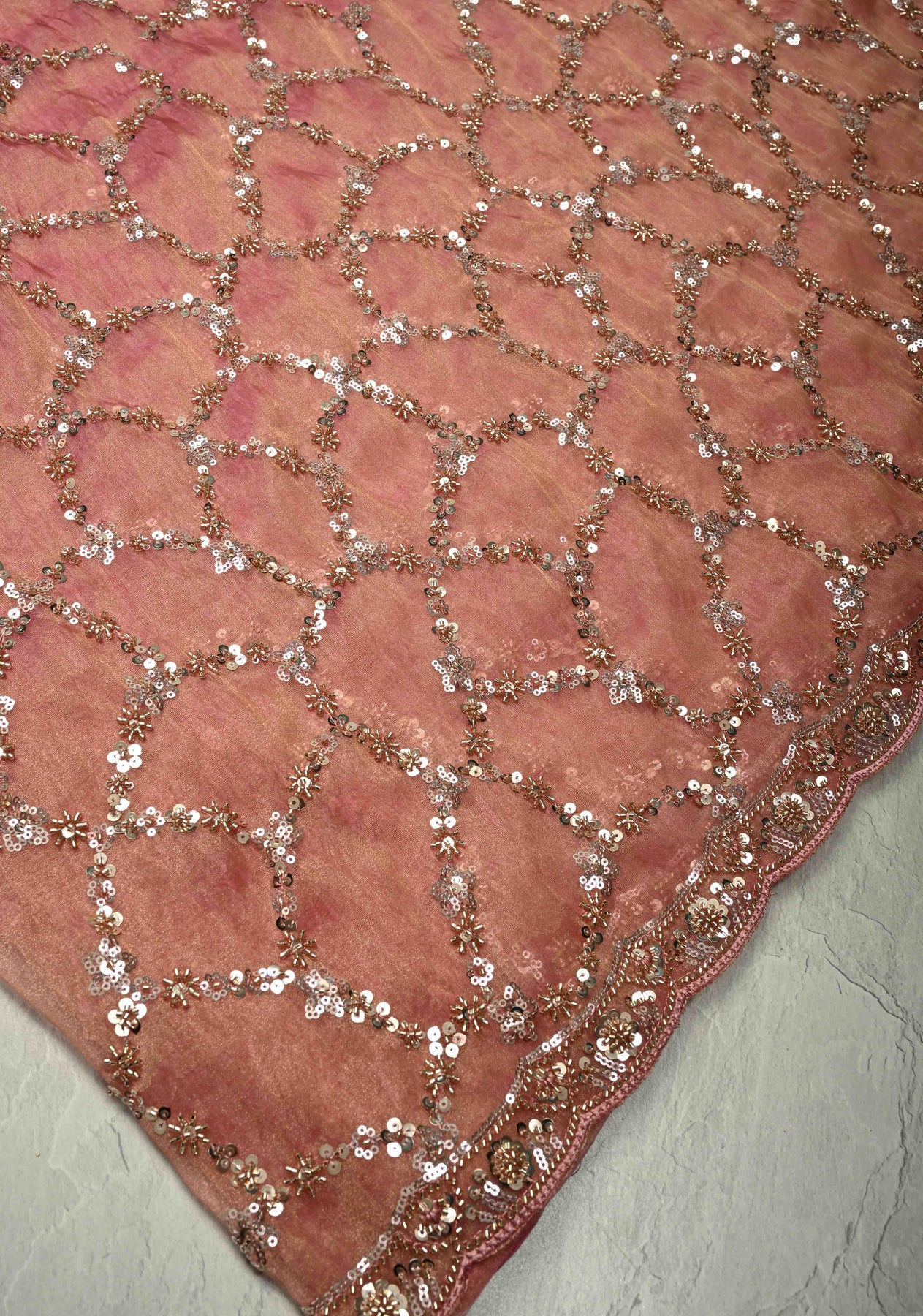 The Pink Shimmer Organza Saree is a delicate masterpiece, designed for timeless elegance and grace. Crafted from sheer Shimmer organza, it showcases a beautifully embroidered jaal pattern enriched with sequins and fine cutdana detailing, adding a soft shimmer to its ethereal silhouette. The graceful onion pink hue lends a romantic charm, while the intricately finished scallop border enhances its feminine appeal. Perfect for weddings, receptions, and festive gatherings, this saree is a harmonious blend of refined craftsmanship and contemporary sophistication.