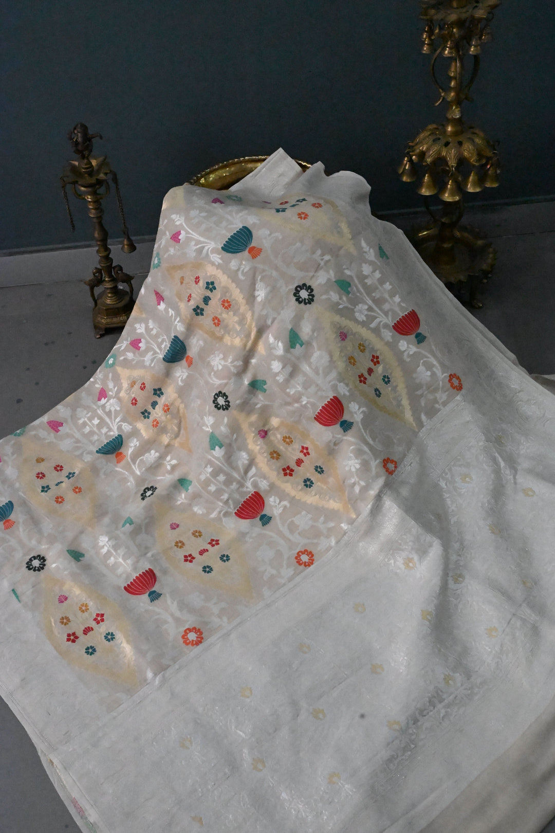 Kora Color Tussar Georgette Saree with Meenakari Floral Brocade Jaal and Silver Zari Border | SILK MARK CERTIFIED | Shobitam