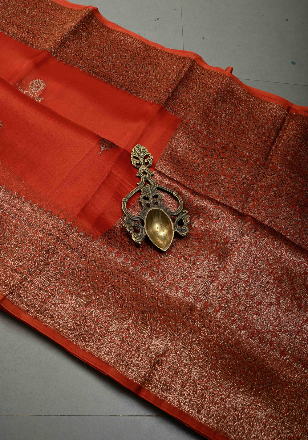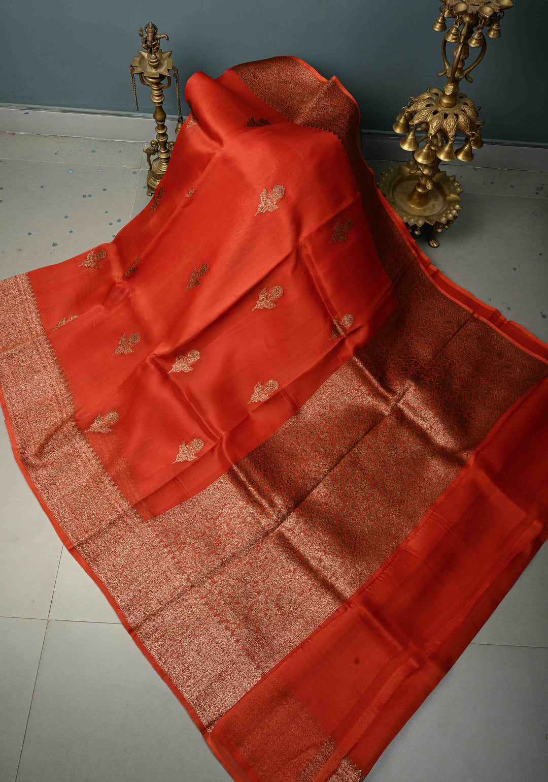 Orange Pure Banarasi Kora Silk Saree with Floral Antique Zari Buttas and Zari Border| SILK MARK CERTIFIED | Shobitam