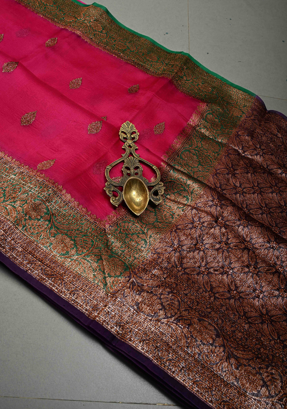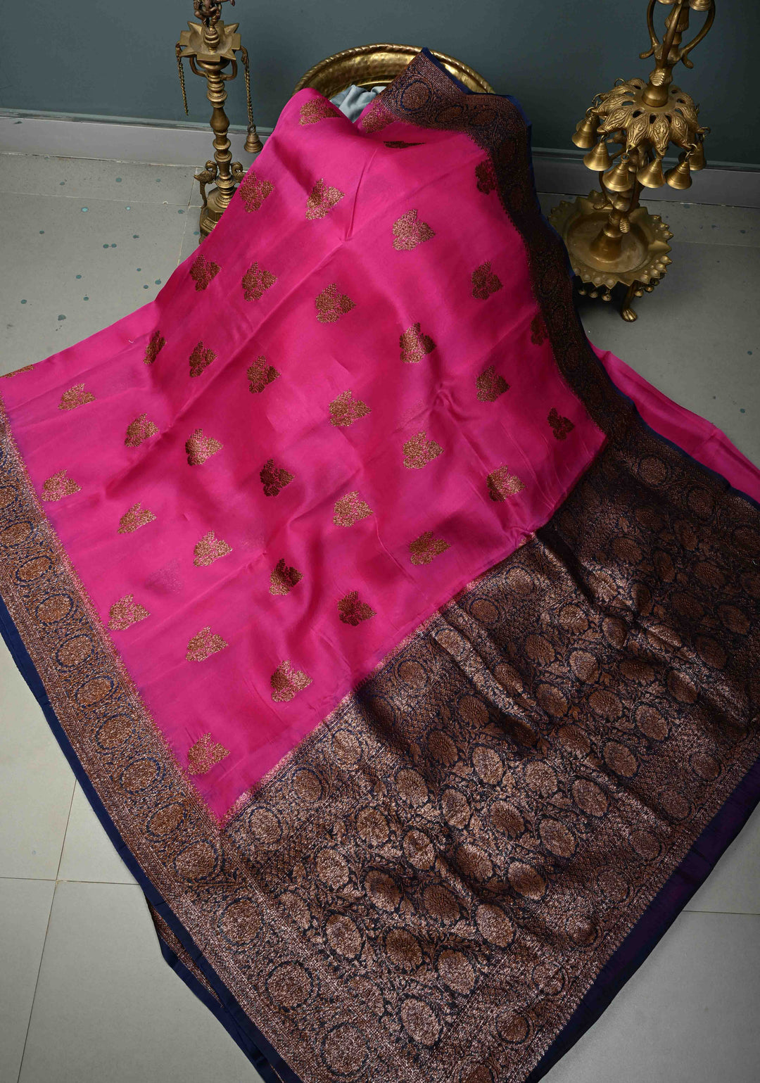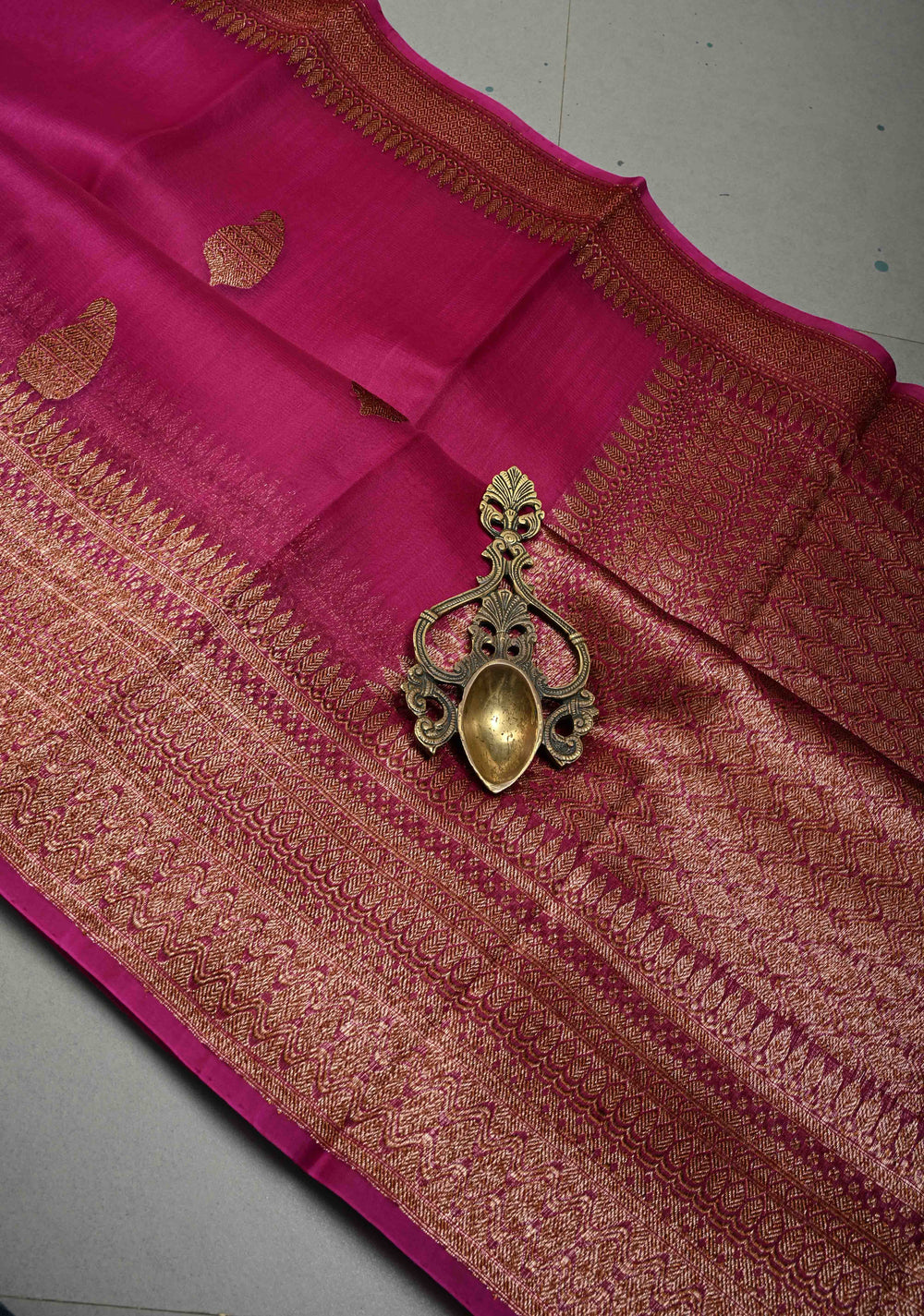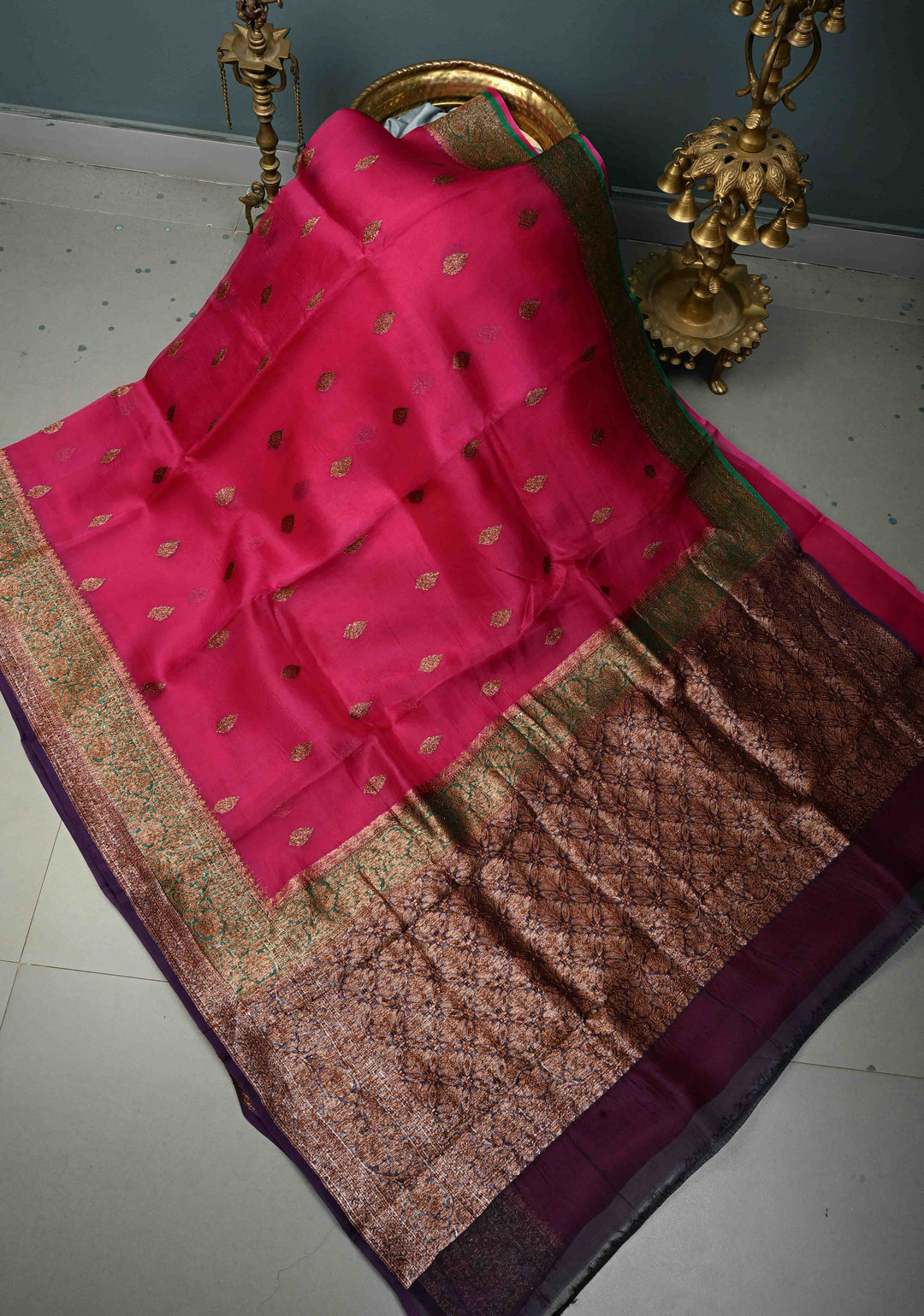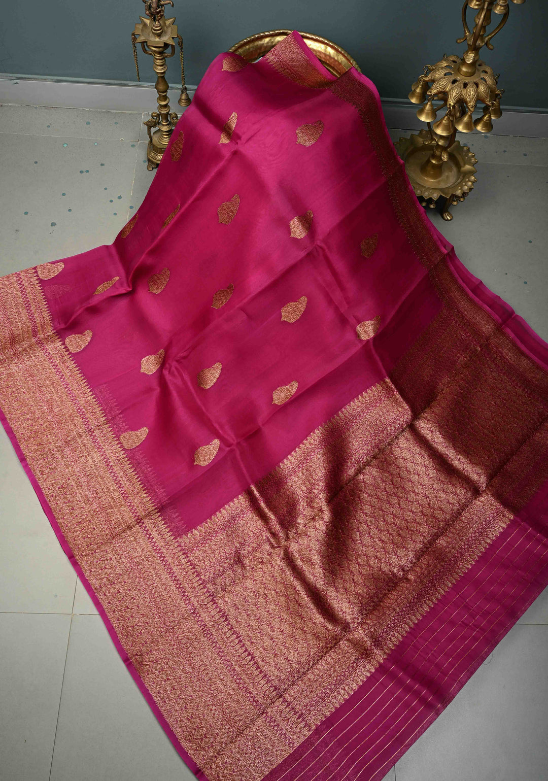 Fushia Pure Banarasi Kora Silk Saree with Floral Antique Oxidized Zari Buttas and Contrast Zari Border| SILK MARK CERTIFIED | Shobitam