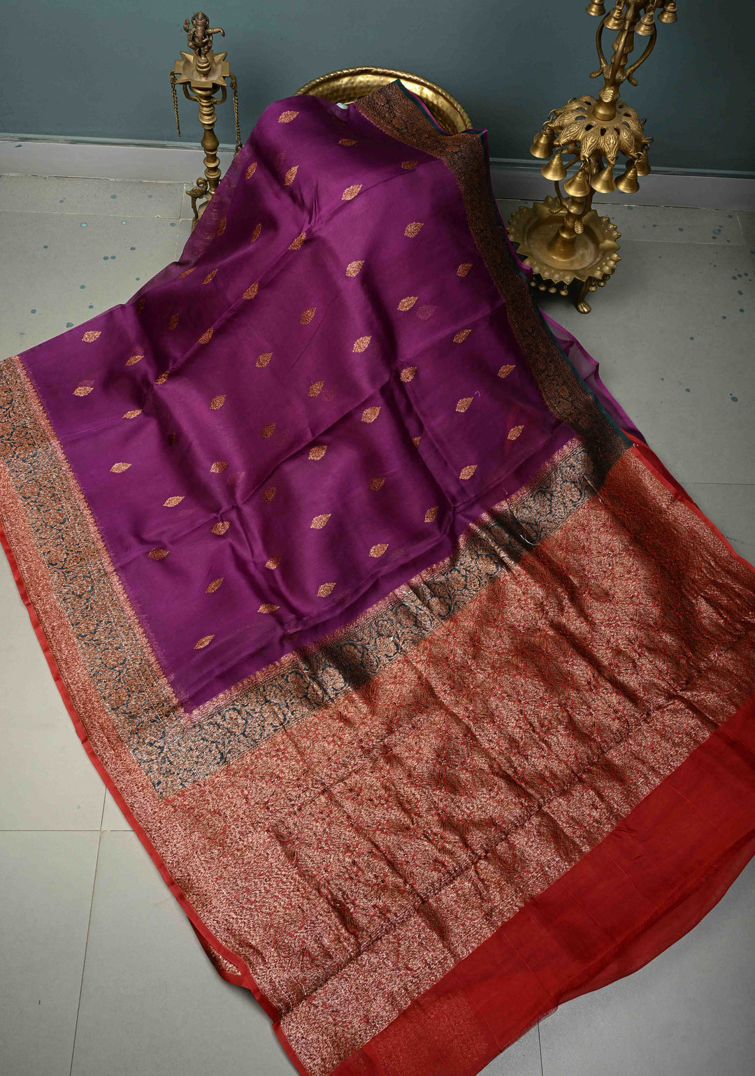 Royal Purple Pure Banarasi Kora Silk Saree with Floral Antique Zari Buttas and Zari Border| SILK MARK CERTIFIED | Shobitam