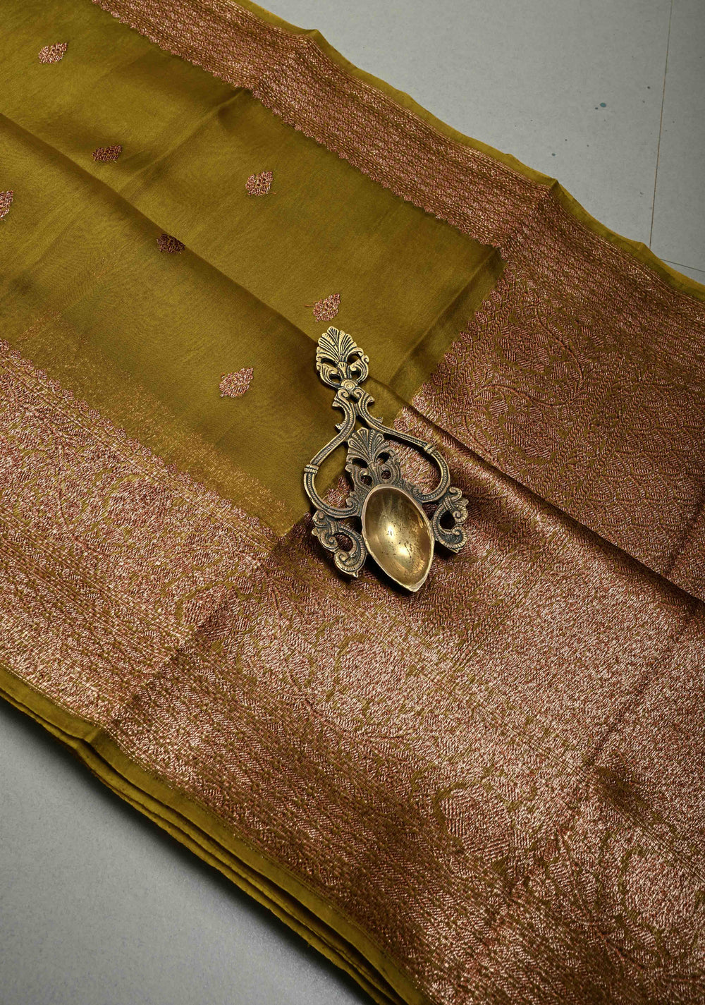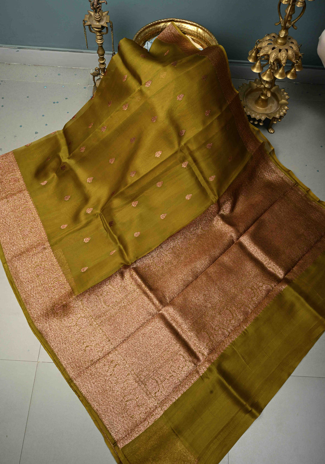 Ollive Green Pure Banarasi Kora Silk Saree with Floral Antique Zari Buttas and Zari Border| SILK MARK CERTIFIED | Shobitam