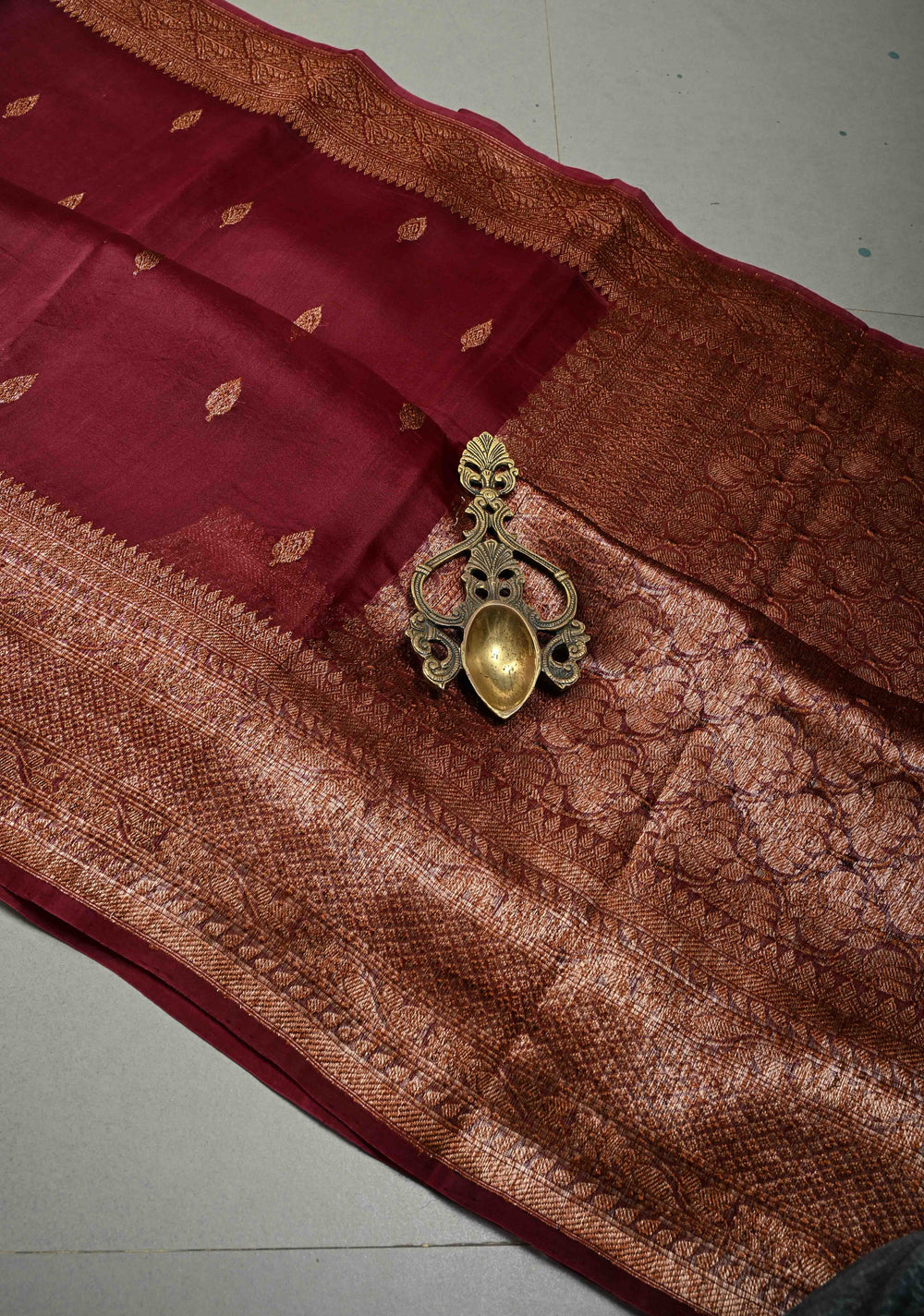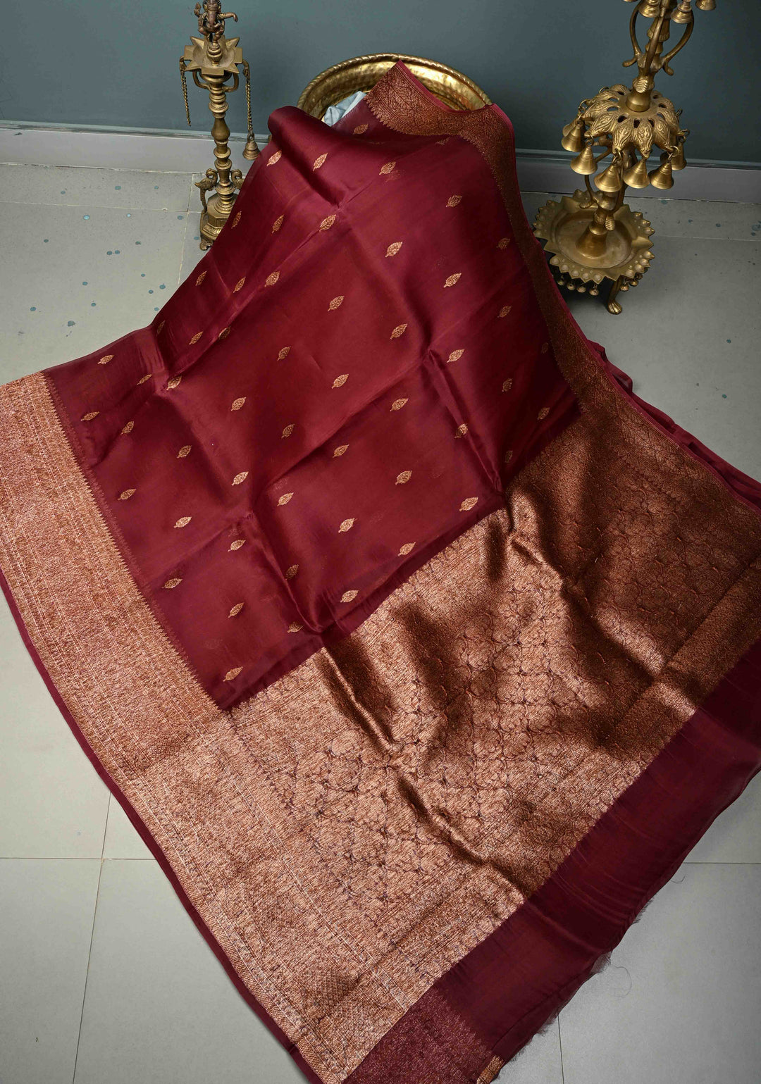 Maroon Pure Banarasi Kora Silk Saree with Floral Antique Zari Buttas and Zari Border| SILK MARK CERTIFIED | Shobitam