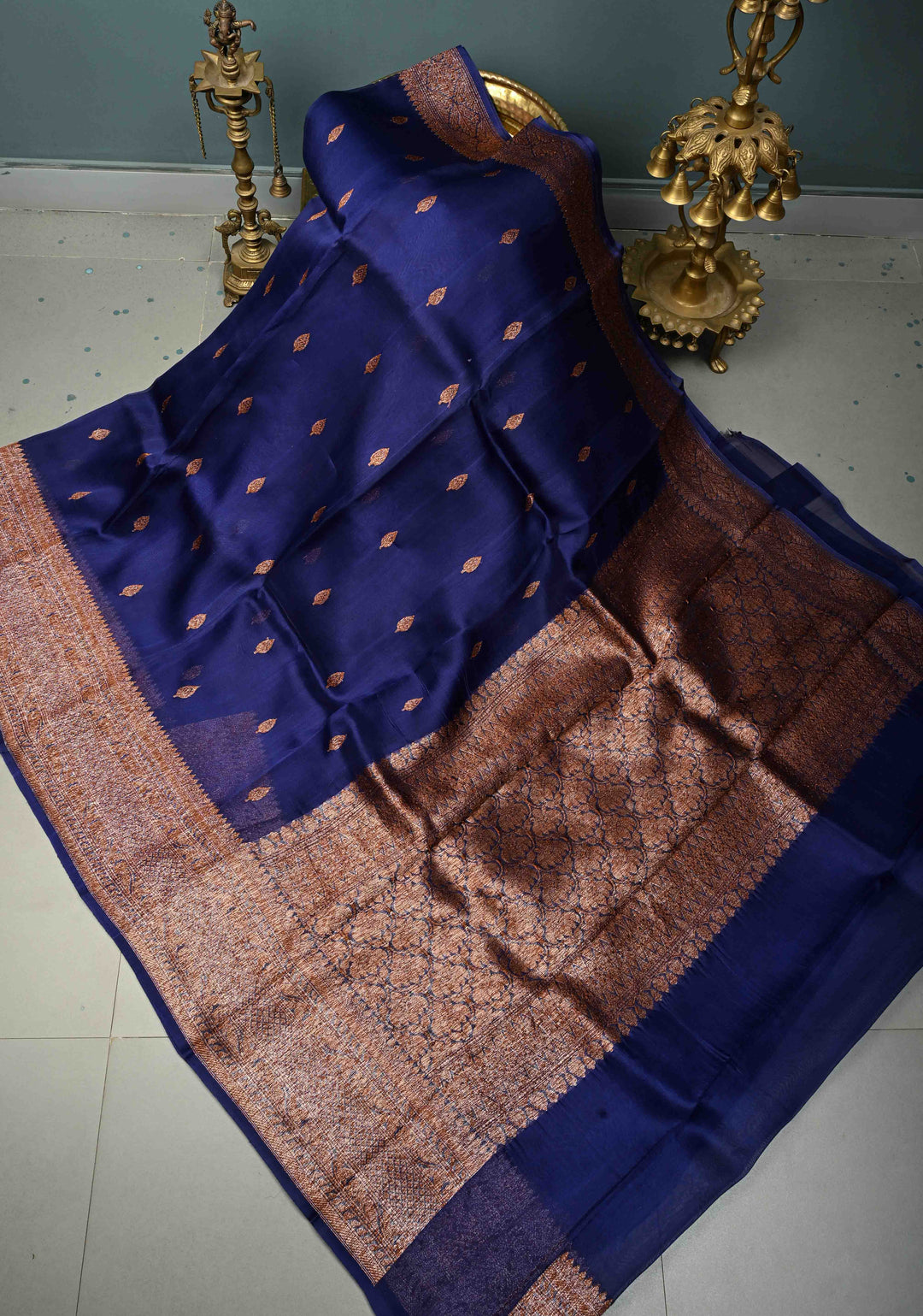Deep Navy Blue Pure Banarasi Kora Silk Saree with Floral Antique Oxidized Zari Buttas and Zari Border | SILK MARK CERTIFIED | Shobitam