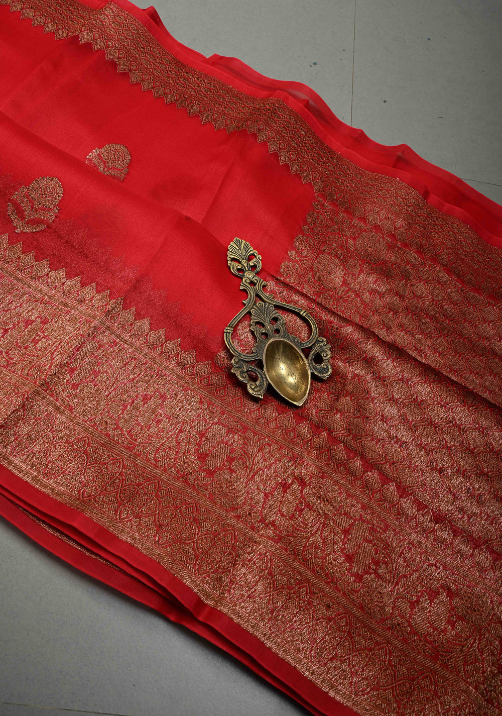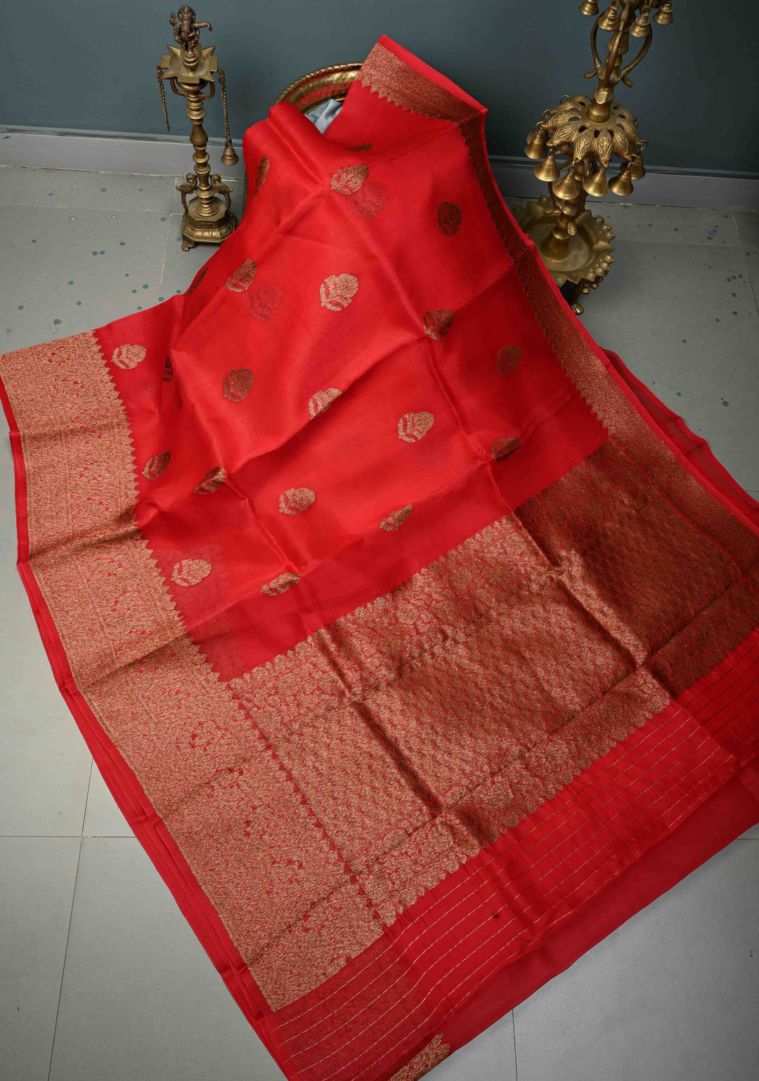 Blood Red Pure Banarasi Kora Silk Saree with Floral Antique Zari Buttas and Zari Border| SILK MARK CERTIFIED | Shobitam