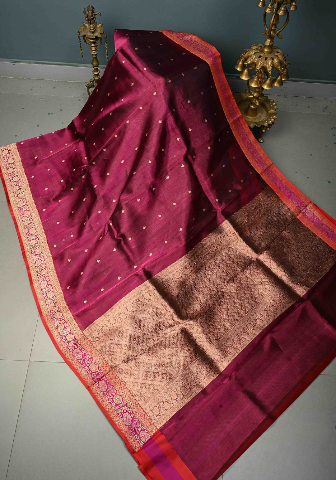 Blood Red Pure Banarasi Kora Silk Saree with Floral Antique Oxidized Zari Buttas and Zari Border| SILK MARK CERTIFIED | Shobitam