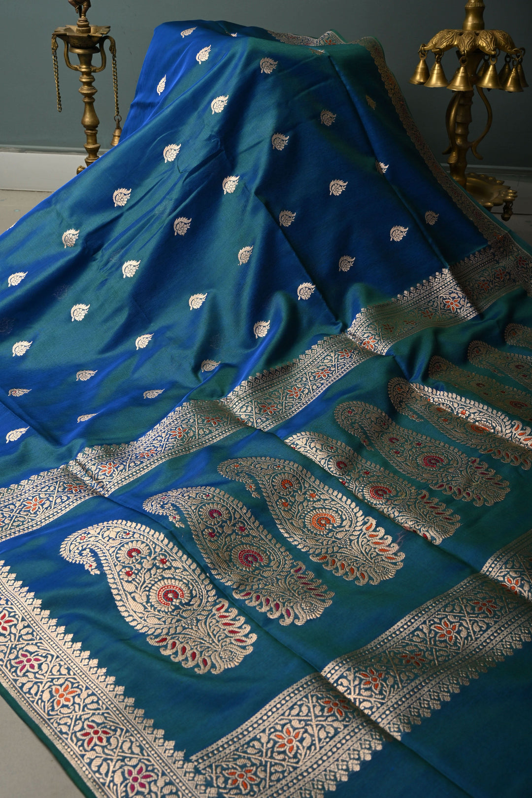Peacock Blue-Green DualTone Banarasi Kora Silk Saree with Floral Zari Buttas and Meenakari Zari Border-Pallu | SILK MARK CERTIFIED | Shobitam