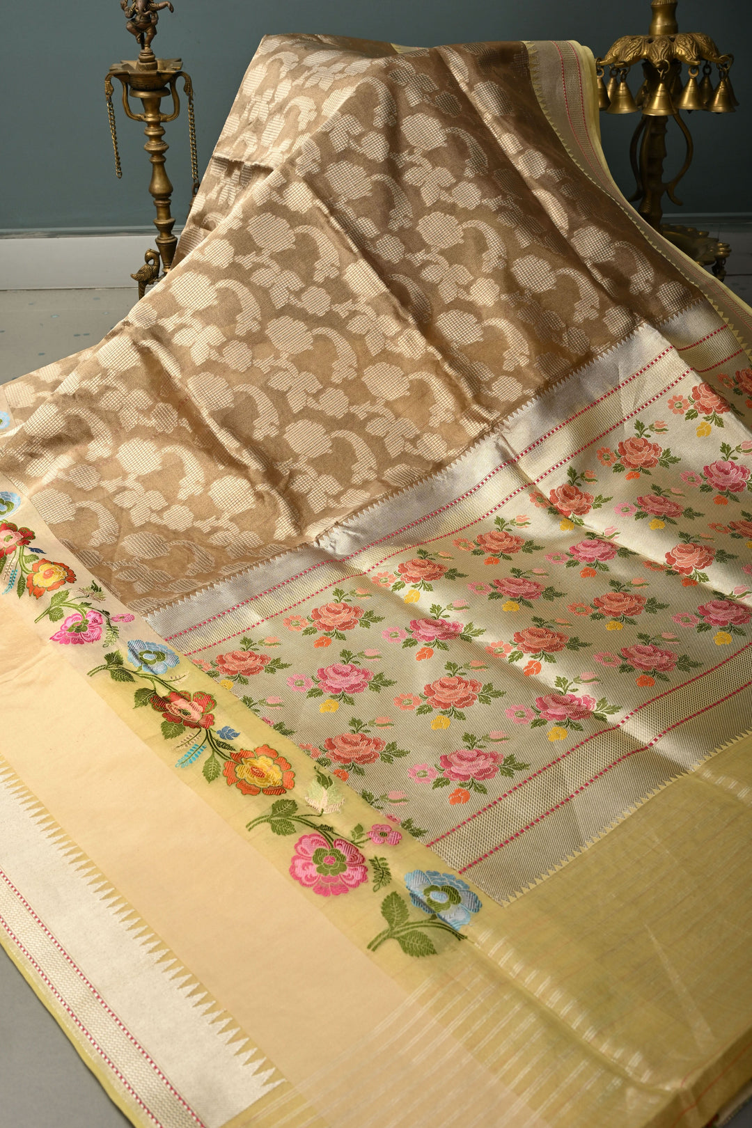 Dusty Olive Green Pure Banarasi Kora Tissue Silk Saree with Sona Rupa Brocade Jaal and Meenakari Floral Panel on Zari Border | SILK MARK CERTIFIED | Shobitam