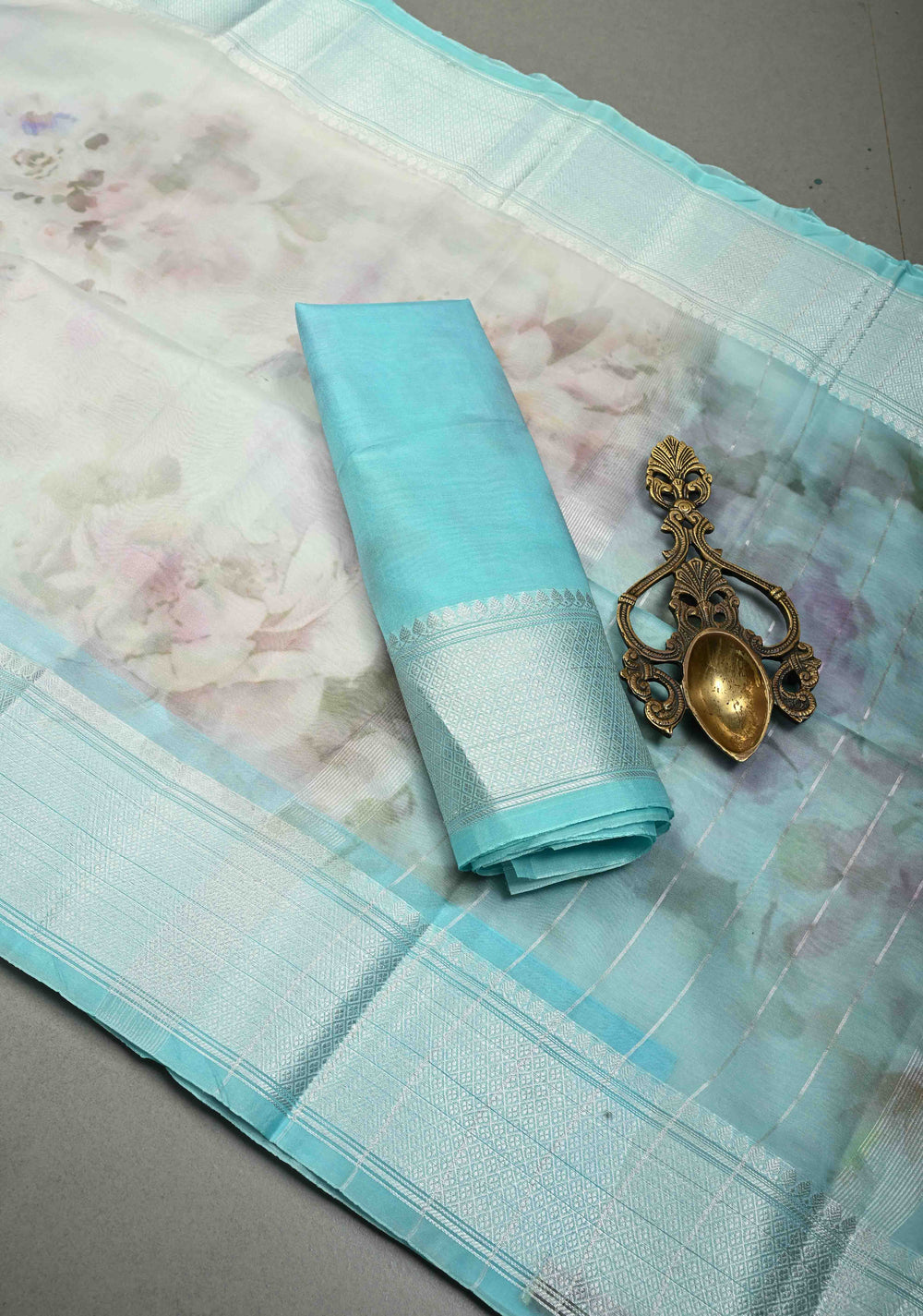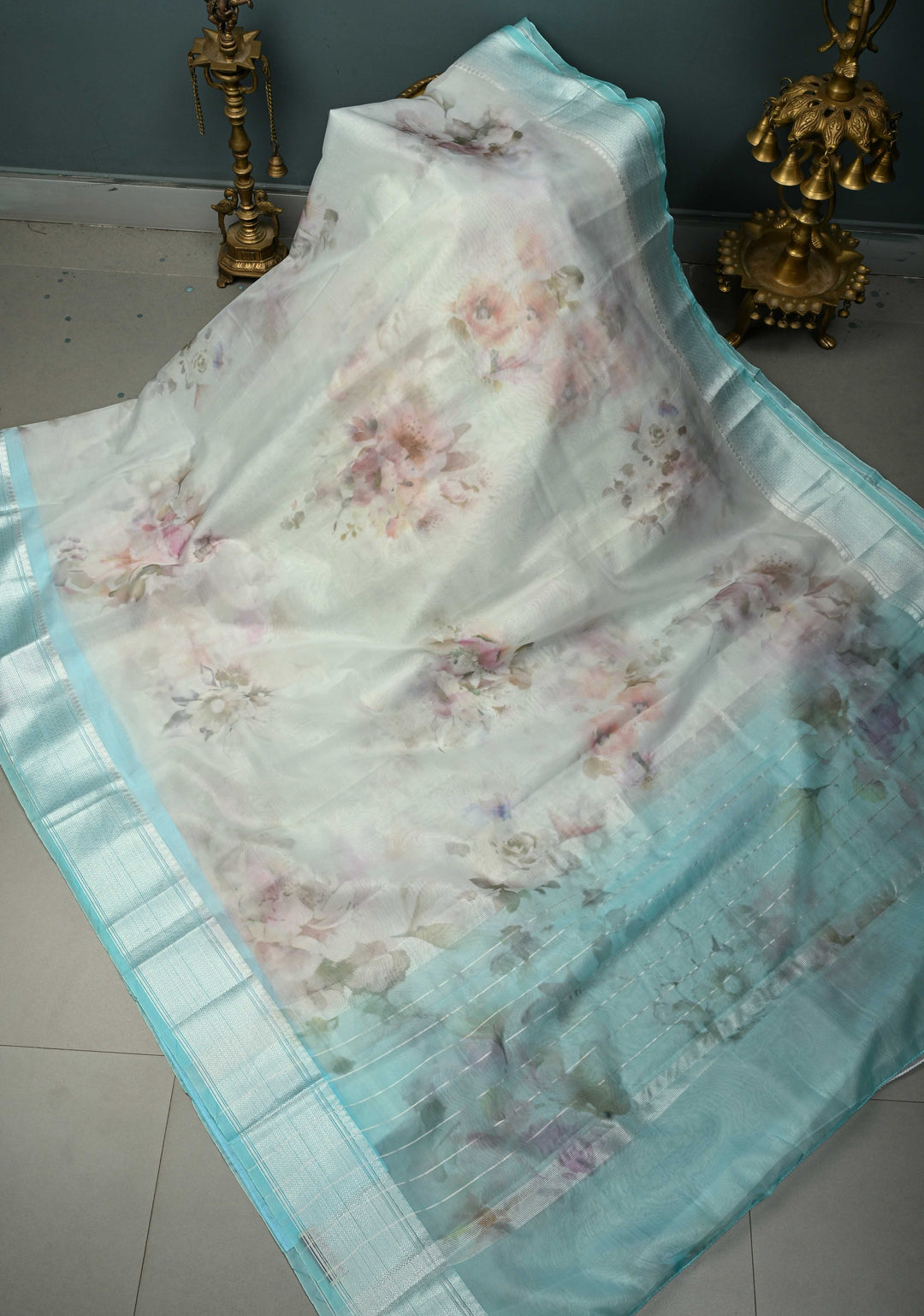 Pastel Blue Banarasi Semi Kora Saree with Floral Digital Print and Silver Zari Border | Shobitam