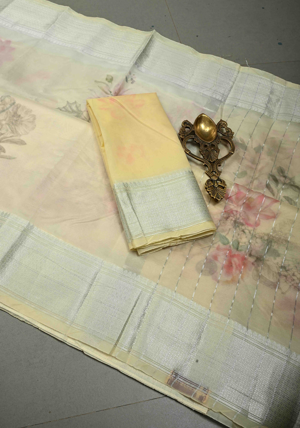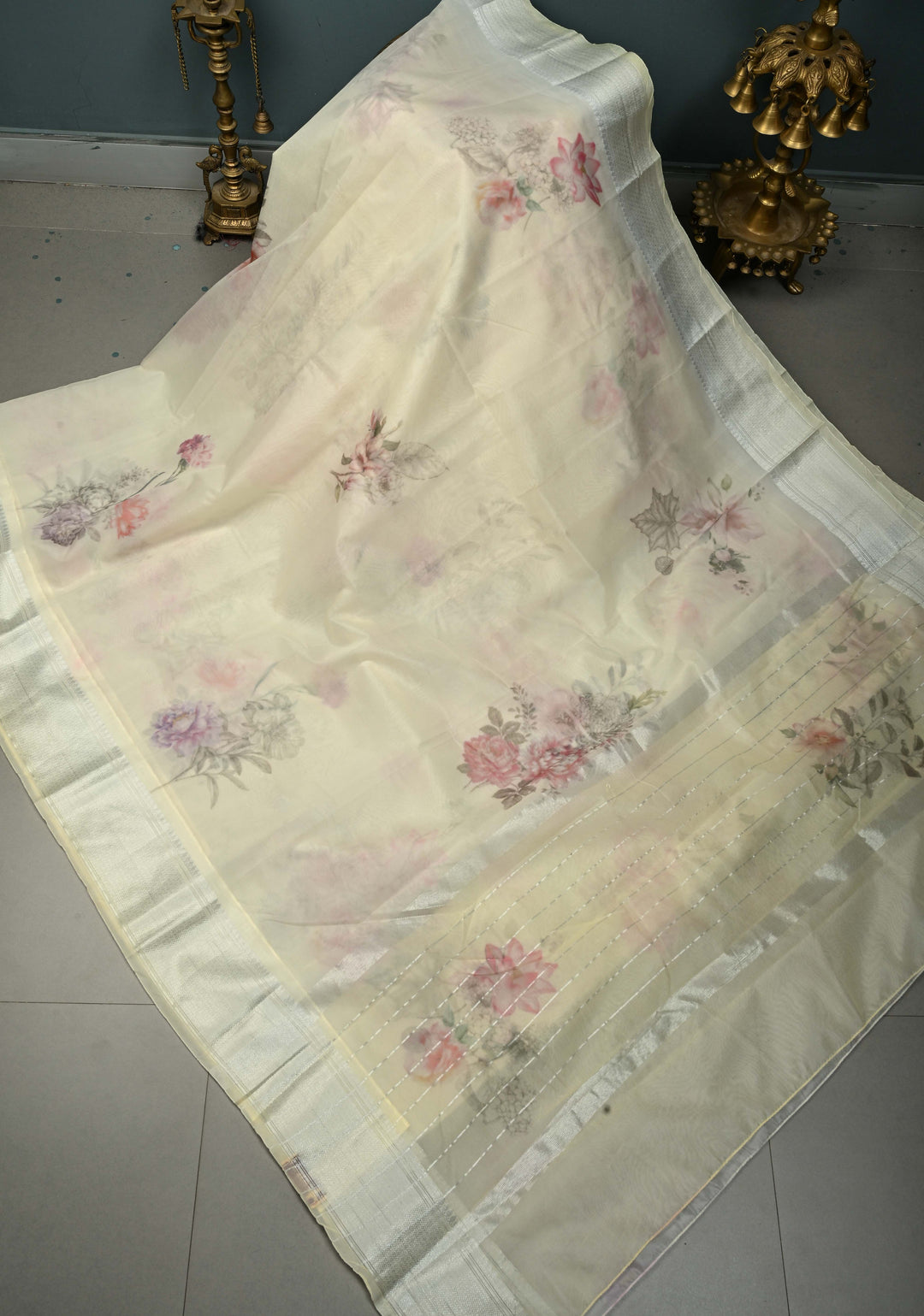 Cream Banarasi Semi Kora Saree with Floral Digital Print and Silver Zari Border | Shobitam