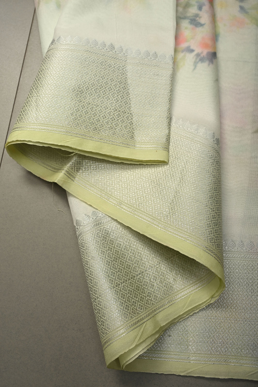 Tea Green Banarasi Semi Kora Saree with Floral Digital Print and Silver Zari Border | Shobitam