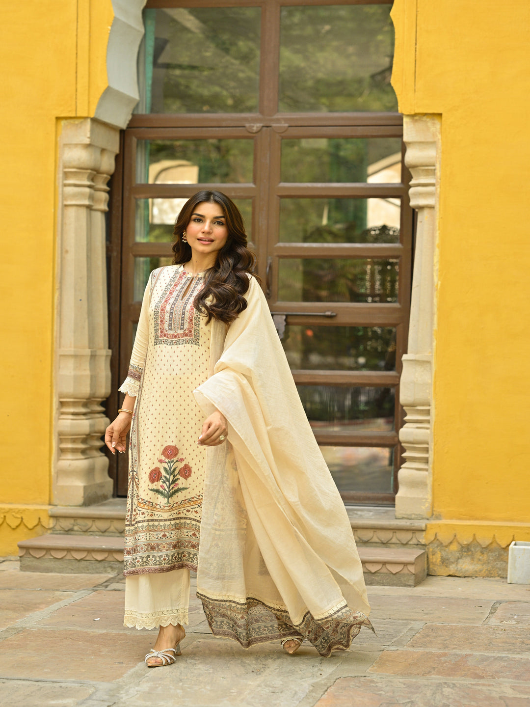 Beige Placement Mughal Heritage Kurta with Kota Doriya Dupatta and Organza Block Print Border-SET OF 3 | SHOBITAM