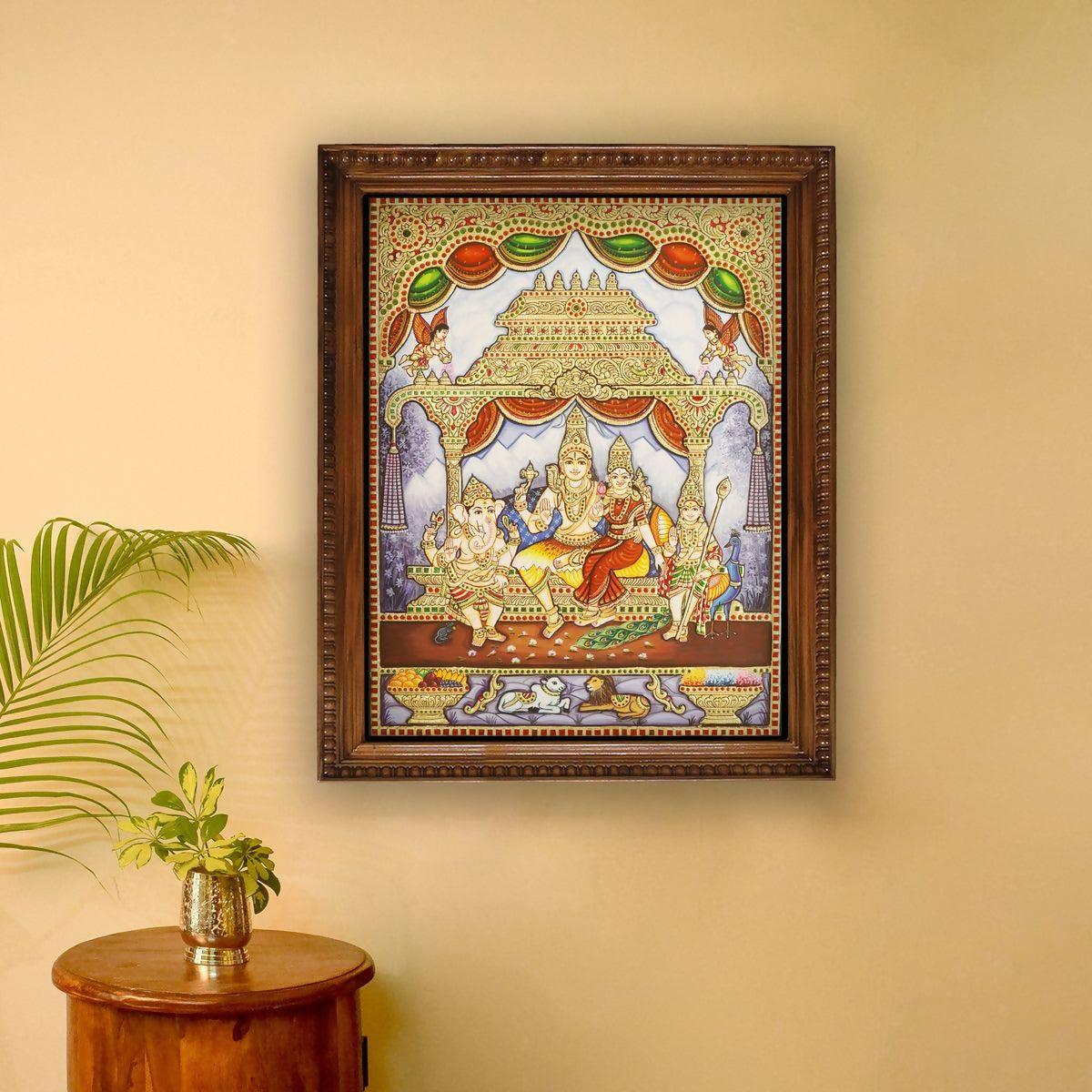 Ideal for devotees, collectors, or as a meaningful gift, this Shiva Family Tanjore painting radiates divine blessings, spiritual elegance, and timeless beauty.