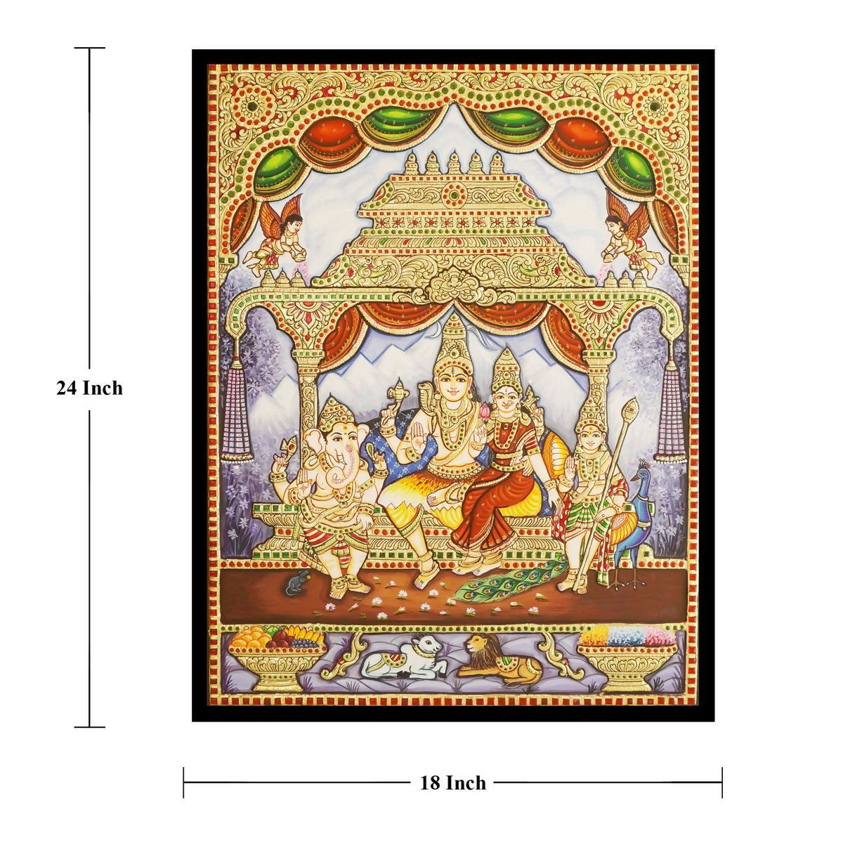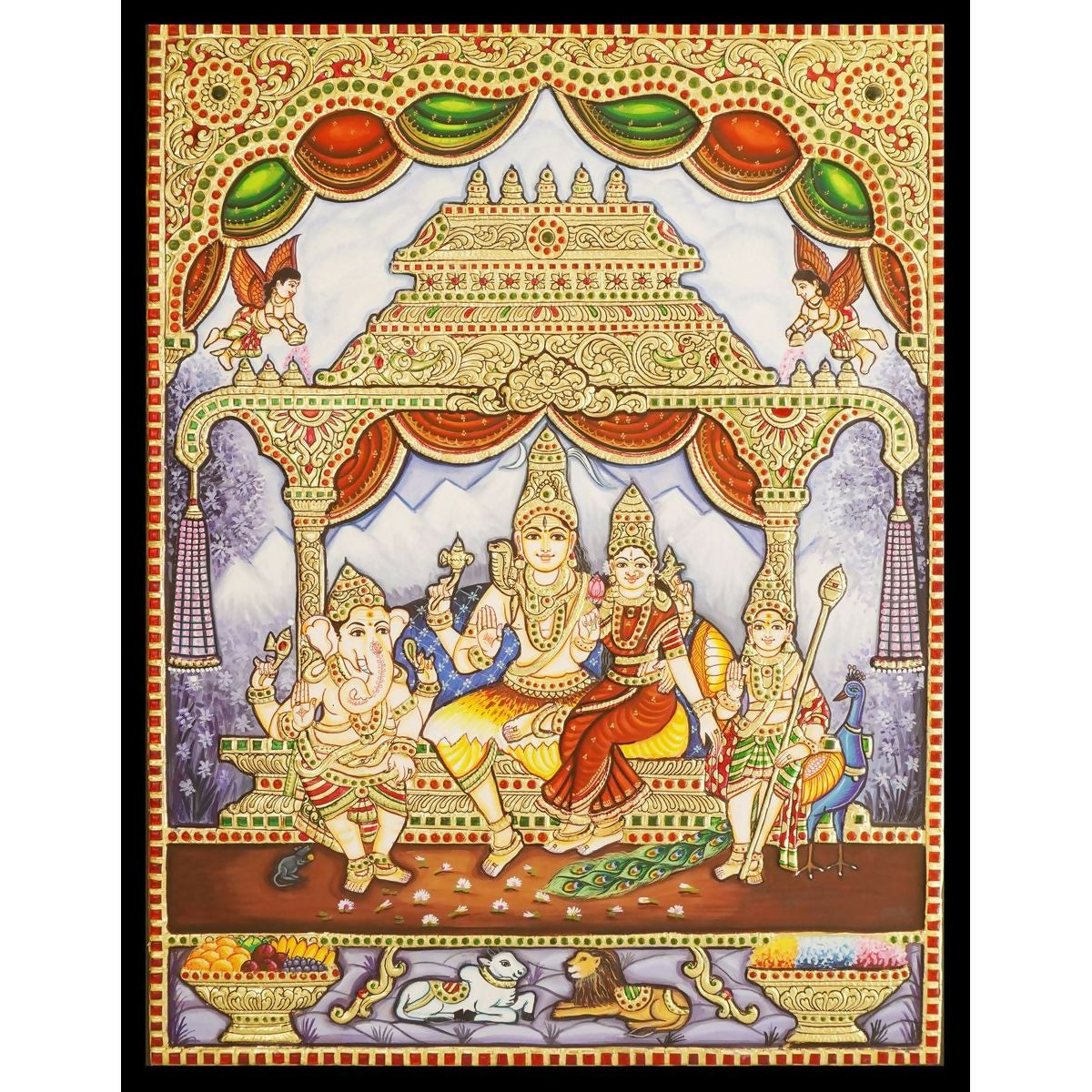 24 x 18 Shiva Family Authentic Tanjore painting with 22 Ct Gold Foil and Jaipur Gemstones, Unframed.