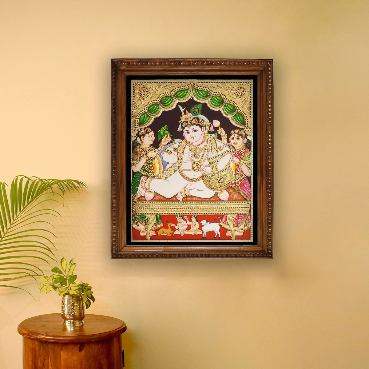 This exquisite Tanjore painting of Butter Krishna embodies the most celebrated ancient art forms of South India, known for their surface richness, vivid colors, among the various themes, the "Navaneetha Krishna" (Butter Krishna) remains the most beloved and auspicious choice for homes and galleries alike. The image of a plump, innocent Bal Krishna (baby Krishna) holding a pot of freshly churned butter symbolizes pure joy, abundance, and the sweetness of life. In Tanjore art, this scene is elevated to a royal status through meticulous craftsmanship.