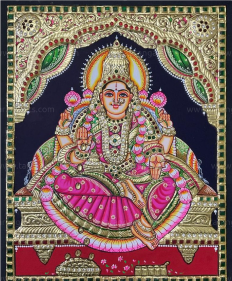 15*12" Dhana Lakshmi Tanjore painting Authentic with 22 Ct Gold Foil and Jaipur Gemstones, Unframed
