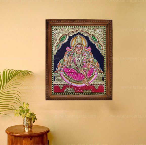 Handcrafted in the traditional Tanjore painting style, the artwork is adorned with 22ct pure gold foil, meticulously applied by skilled artisans using age-old techniques. The radiant gold embellishments enhance the sacred aura and grandeur of the painting, making it an ideal centerpiece for prayer rooms, living spaces, or spiritual collections.