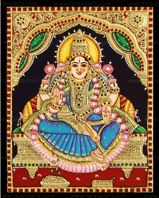 Handcrafted in the traditional Tanjore painting style, the artwork is adorned with 22ct pure gold foil, meticulously applied by skilled artisans using age-old techniques. The radiant gold embellishments enhance the sacred aura and grandeur of the painting, making it an ideal centerpiece for prayer rooms, living spaces, or spiritual collections.