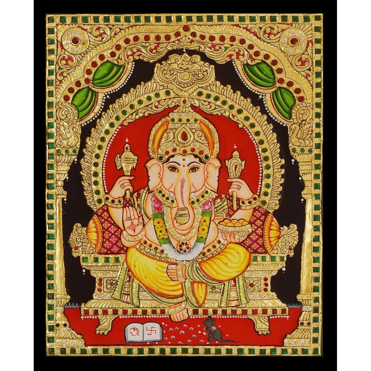 15*12" Ganesha Tanjore Painting Authentic with 22 Ct Gold Foil and Jaipur Gemstones, Unframed