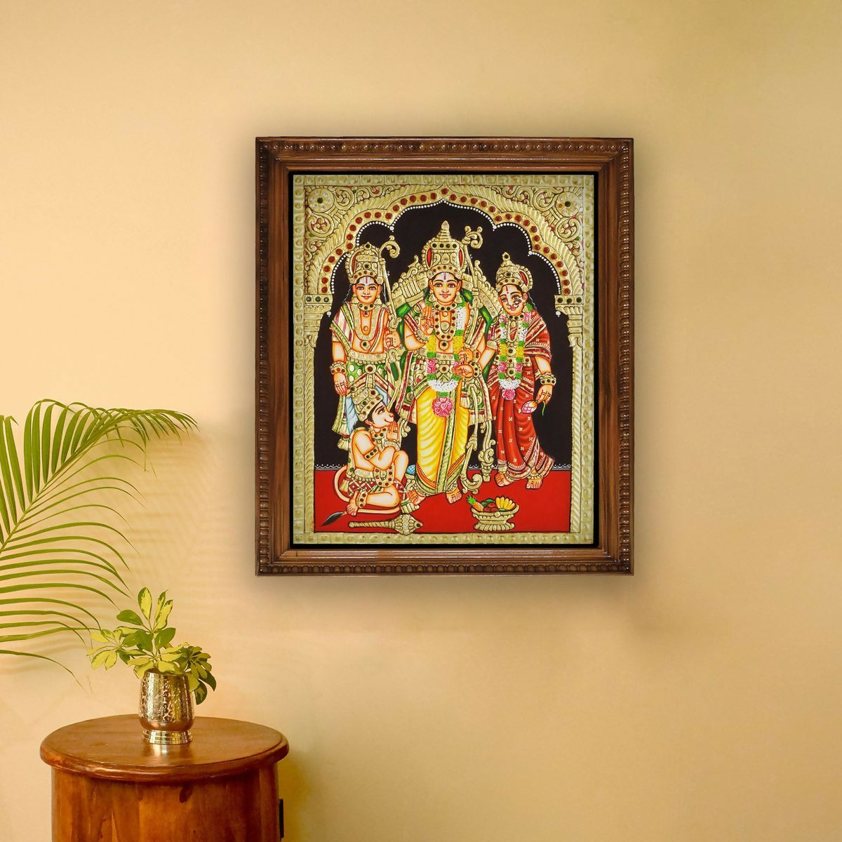 Handcrafted in the traditional Tanjore painting style, the artwork is adorned with 22ct pure gold foil, meticulously applied by skilled artisans using age-old techniques. The radiant gold embellishments enhance the grandeur and sacred aura of the painting, making it a striking centerpiece for prayer rooms, living spaces, or spiritual collections.