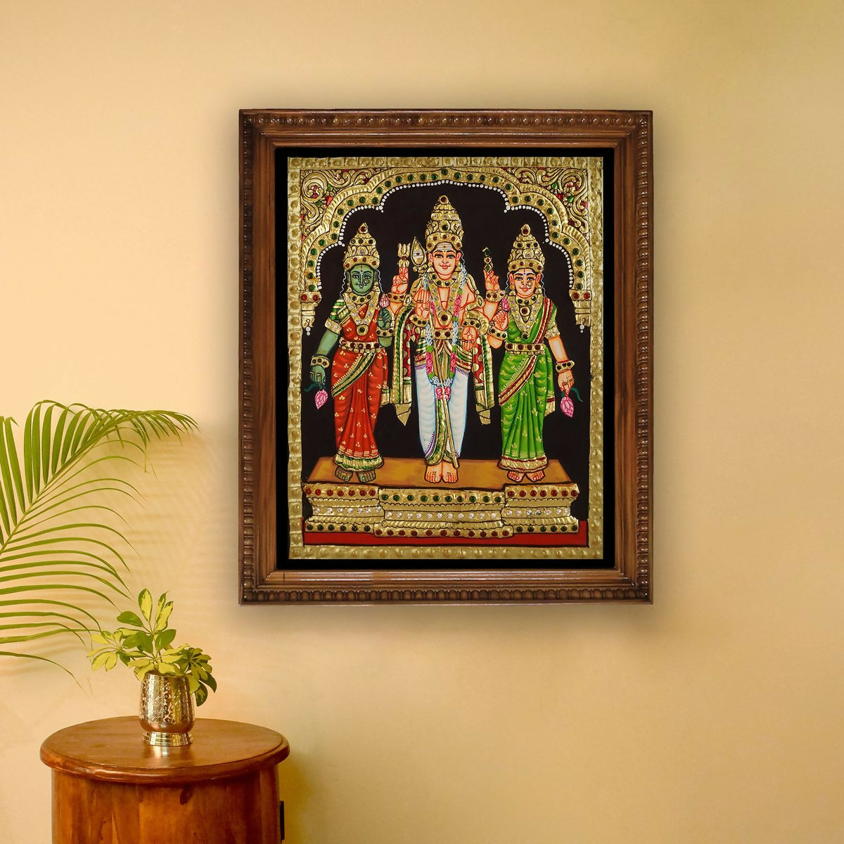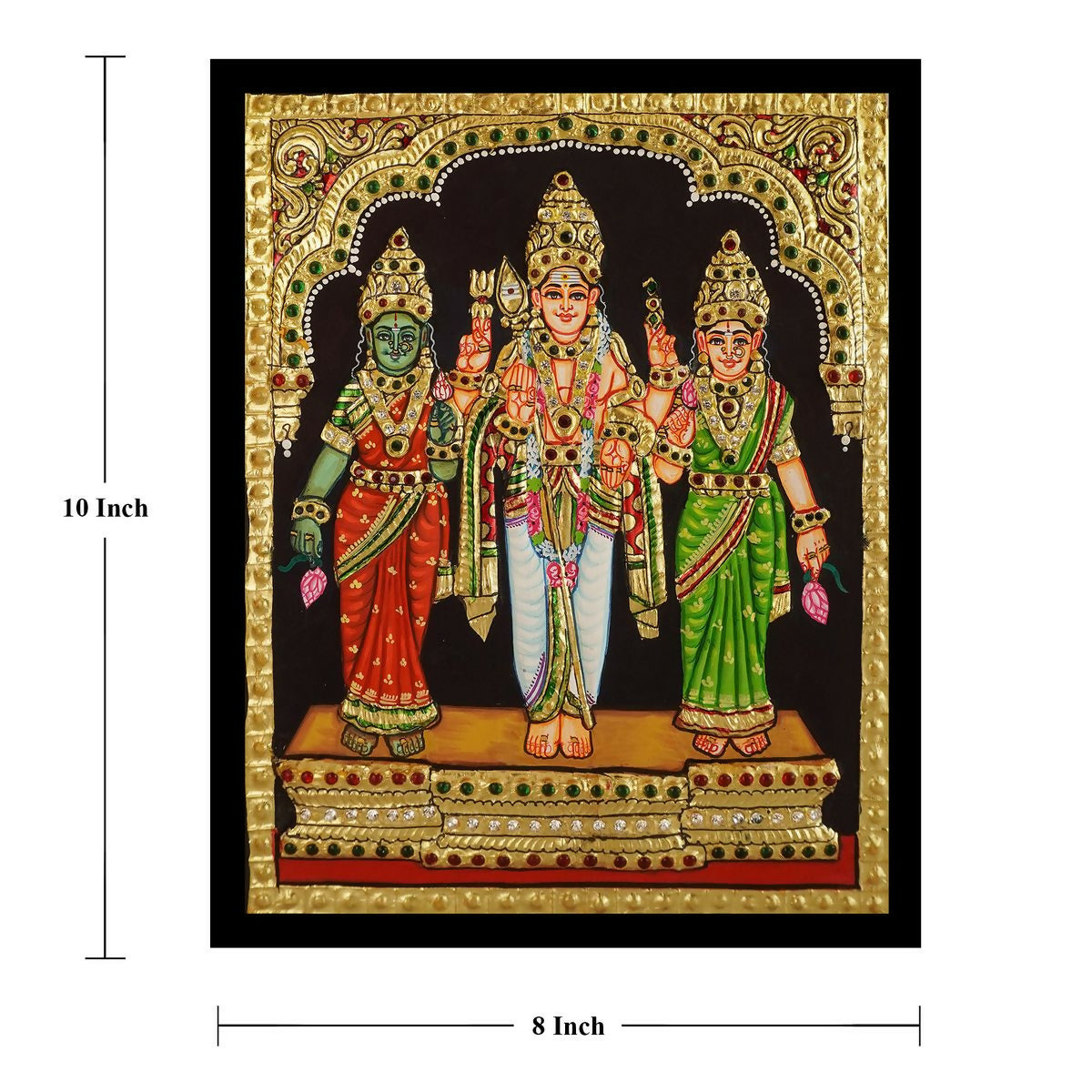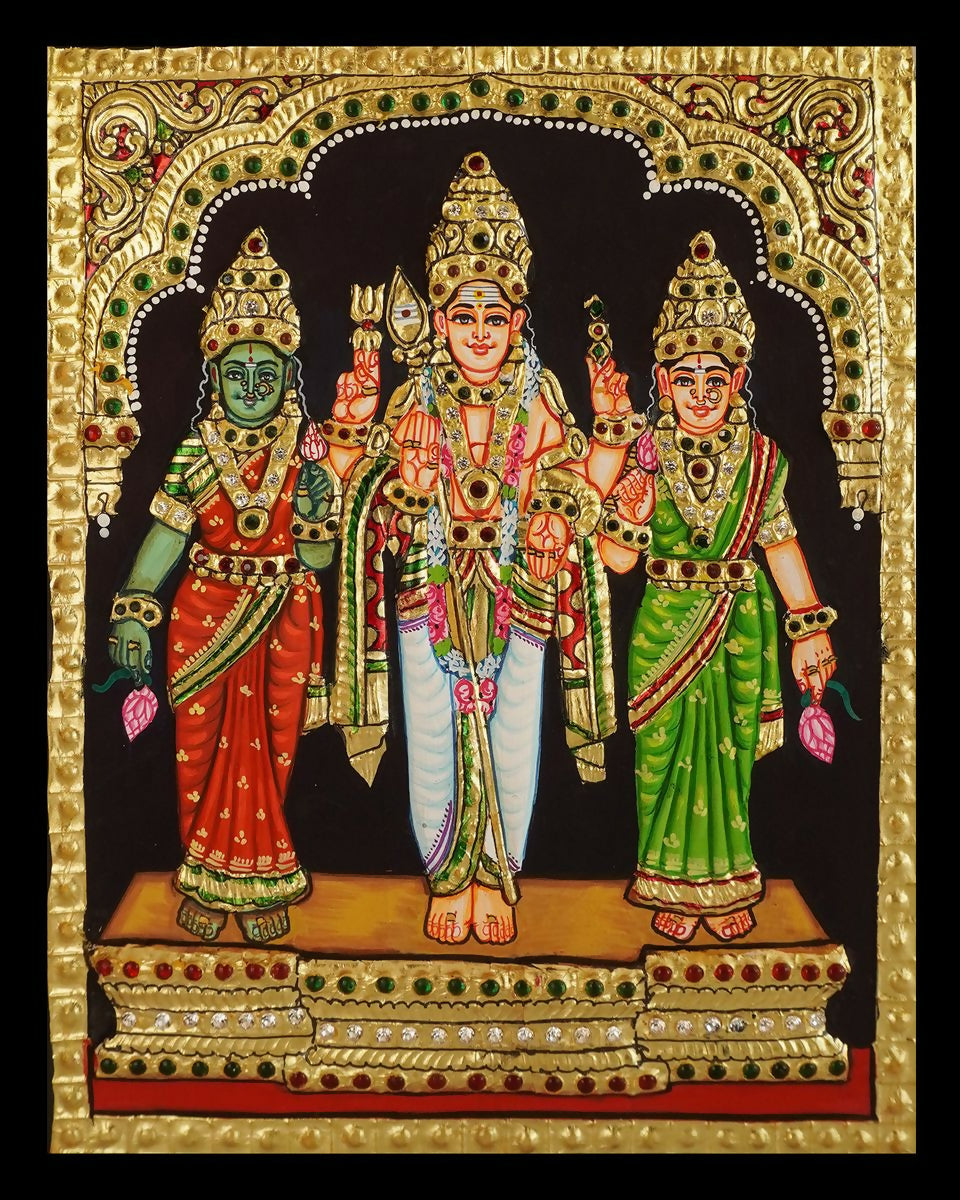 10x8" Tanjore painting of Lord Murugan with Valli and Devayani Authentic With 22 Ct gold Foil and Jaipur Gemstones ,Unframed