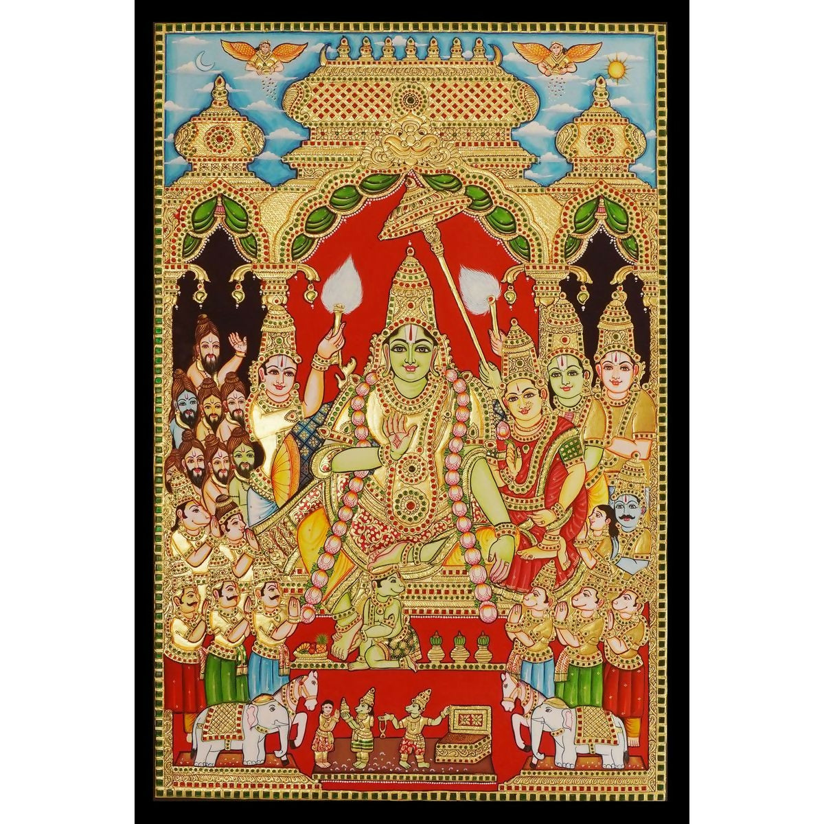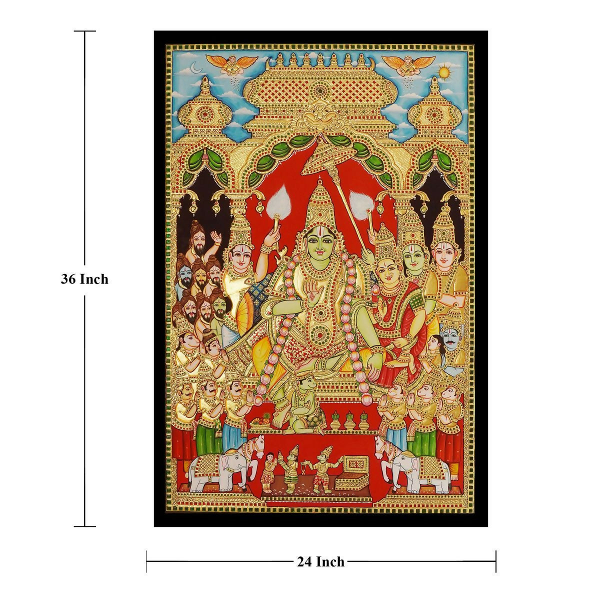 The Tanjore Painting Ramar Pattabhishegam beautifully depicts the divine coronation of Lord Rama, with Sita, Lakshmana, Bharata, Shatrughna, and Hanuman in a sacred and auspicious composition. Crafted in the traditional Tanjore art style, this masterpiece features rich colors, intricate hand detailing, and embossed work highlighted with gold foil that adds depth and brilliance. Symbolizing righteousness, devotion, and prosperity, this painting is ideal for home temples, living spaces, or as a meaningful spiritual gift.