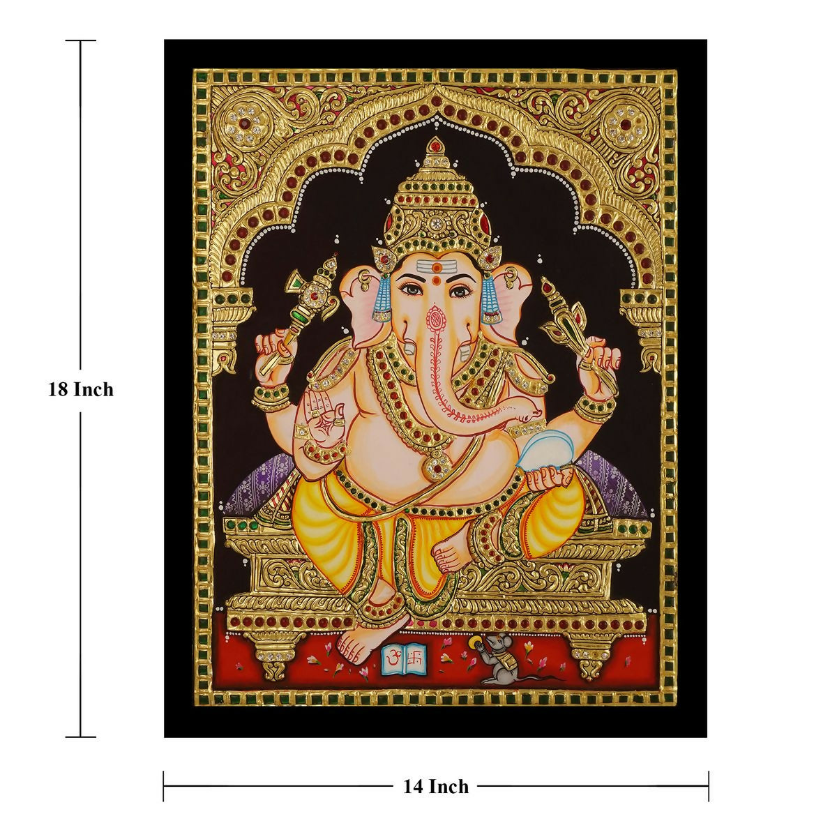 18*14" Red Dhothi Ganesha Tanjore Painting Authentic with 22 Ct Gold Foil and Jaipur Gemstones, Unframed
