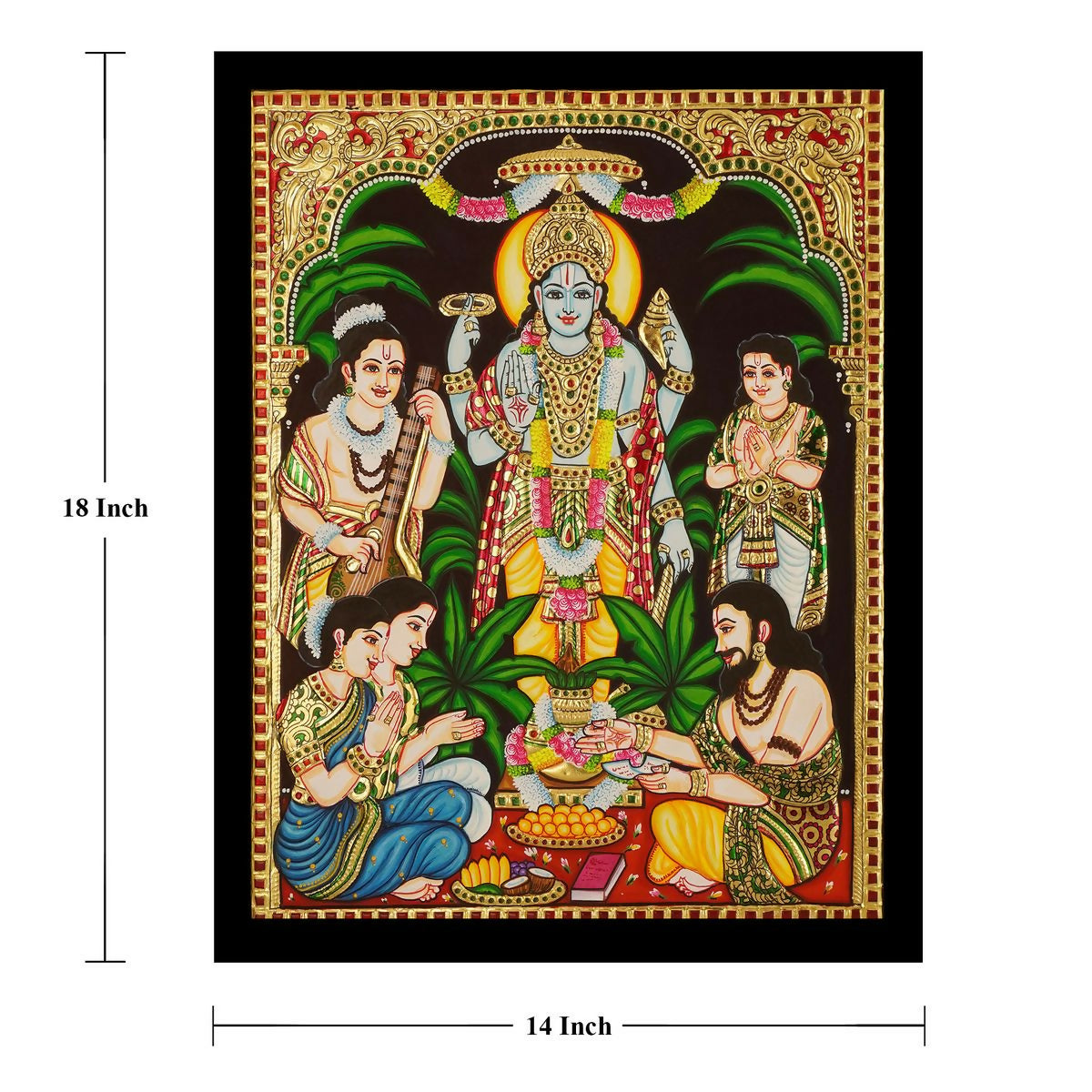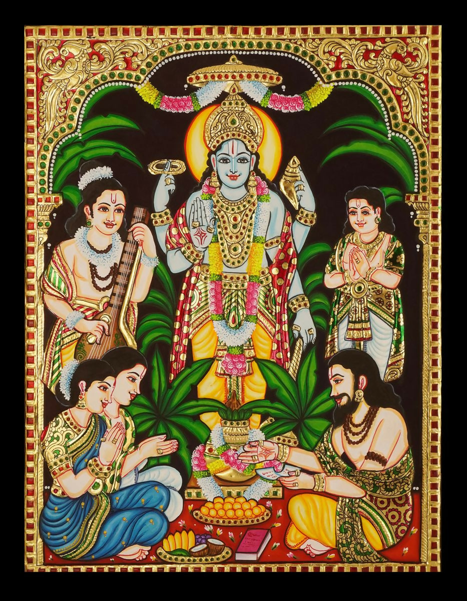 18*14" Sathyanarayana Tanjore Painting Authentic With 22 Ct Gold Foil and Jaipur Gemstones, Unframed