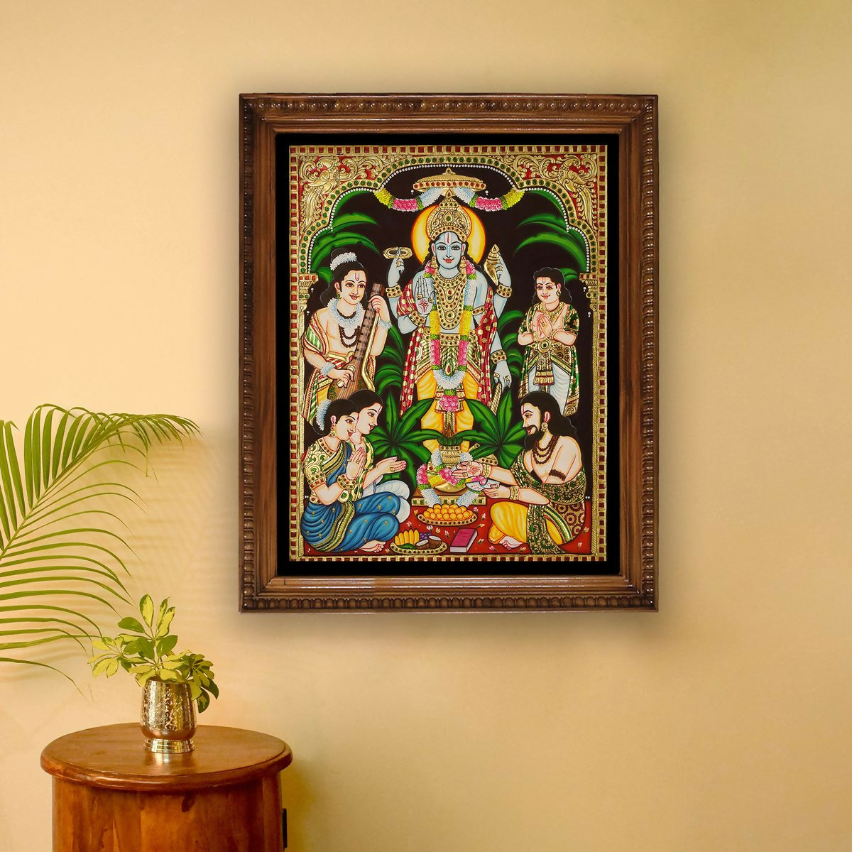 This exquisite Tanjore painting of Lord Sathyanarayana embodies divine blessings, prosperity, and spiritual fulfillment. Revered as a form of Lord Vishnu, Lord Sathyanarayana symbolizes truth, devotion, and the grace that fulfills the wishes of devotees. Depicted in a serene and majestic form, this artwork captures the benevolent presence of the Lord, bringing peace and positivity to any space.
