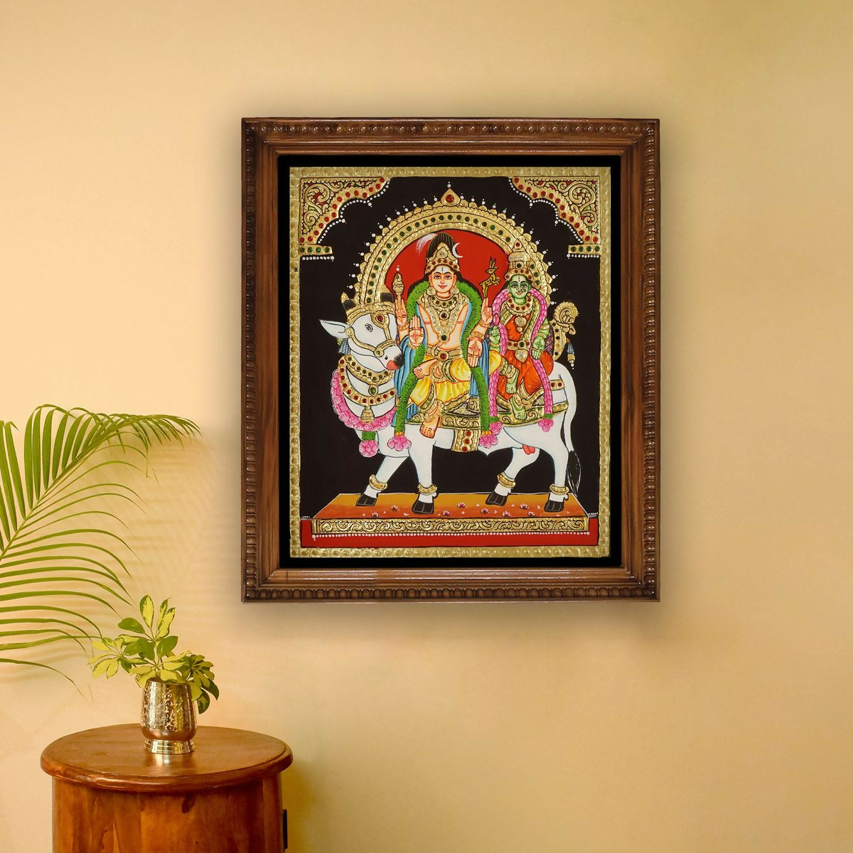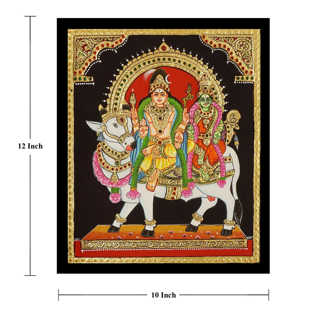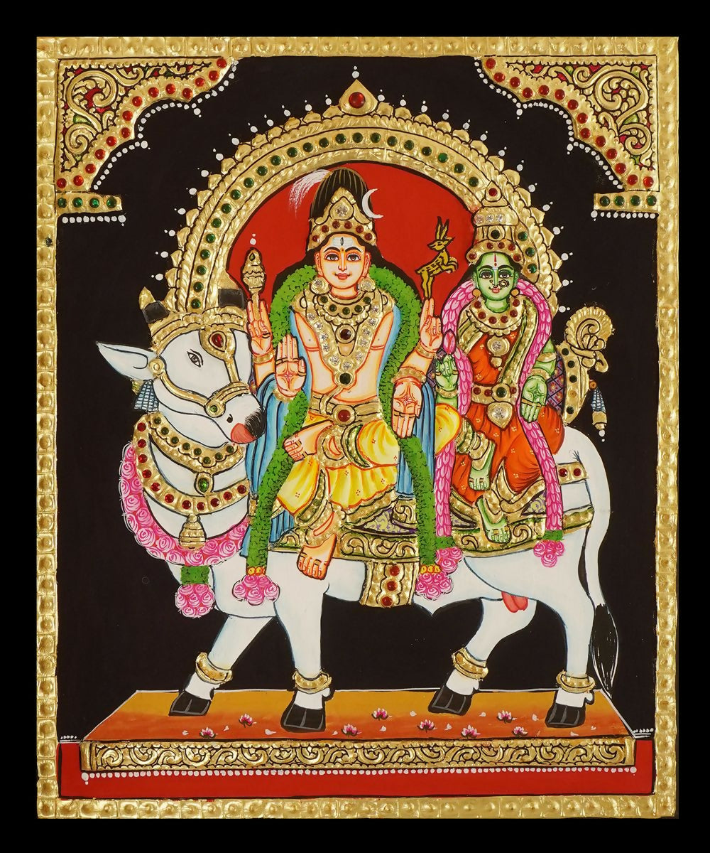 12x10" Tanjore Painting Shiva Parvathi on Nandi Authentic With 22 Ct gold Foil and Jaipur Gemstones ,Unframed