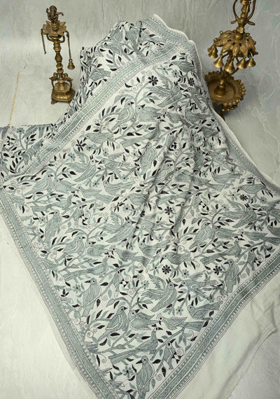 Light Gray Nakshi Kantha Embroidery on Cotton saree