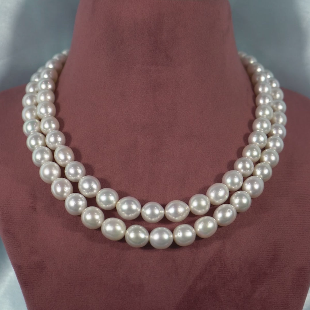 Make a statement with this stunning South Sea pearl necklace, crafted from premium white saltwater cultured pearls. Featuring two elegant rows of 10–11 mm round pearls of AA quality, this 18-inch piece exudes timeless beauty and refinement. Weighing approximately 679.4 grams, it comes with a lifelong guarantee and a Certificate of Authenticity, assuring you of its genuine craftsmanship. Ideal for weddings, formal dinners, or festive events, this necklace complements sarees, gowns, and contemporary wear with equal grace and elegance