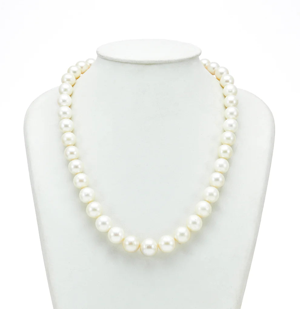 Elevate your elegance with this exquisite South Sea Saltwater Cultured Pearl necklace. Featuring radiant white, A-quality round pearls sized 10–11 mm, this single-row 18-inch strand weighs approximately 453 grams. Crafted with precision, each pearl comes with a Certificate of Authenticity and is backed by a lifelong guarantee. This timeless piece complements formal gowns, ethnic wear, and business attire, making it ideal for weddings, celebrations, or sophisticated evenings out.