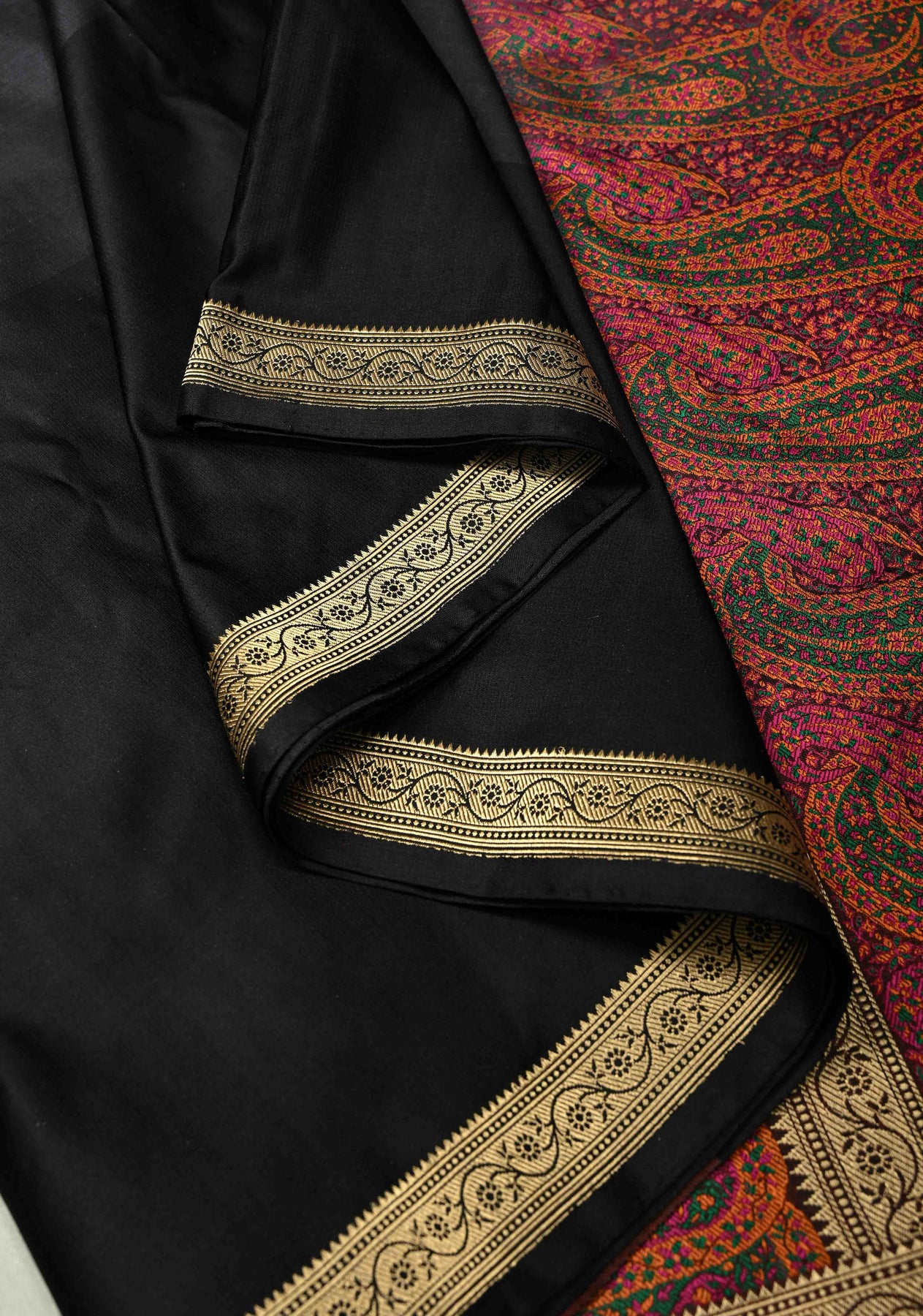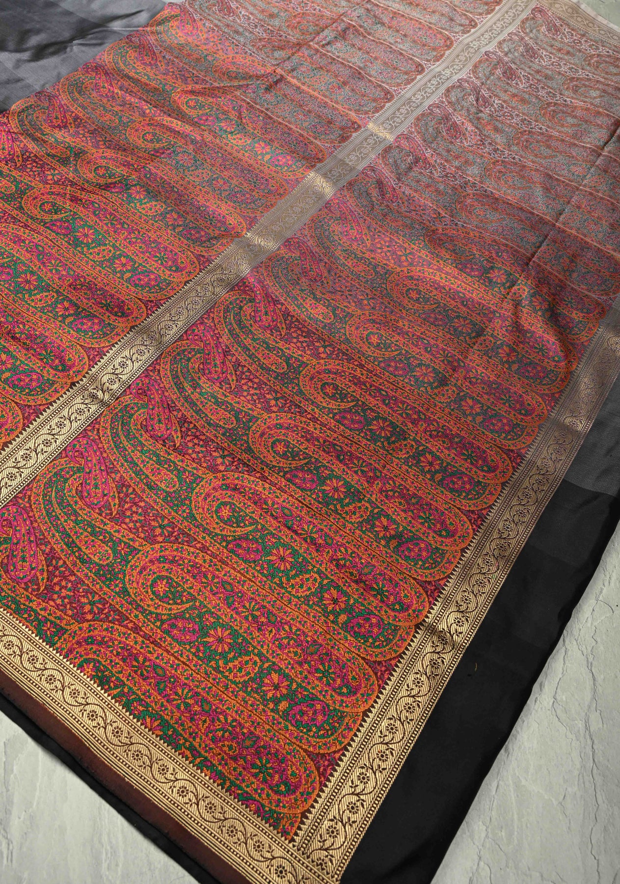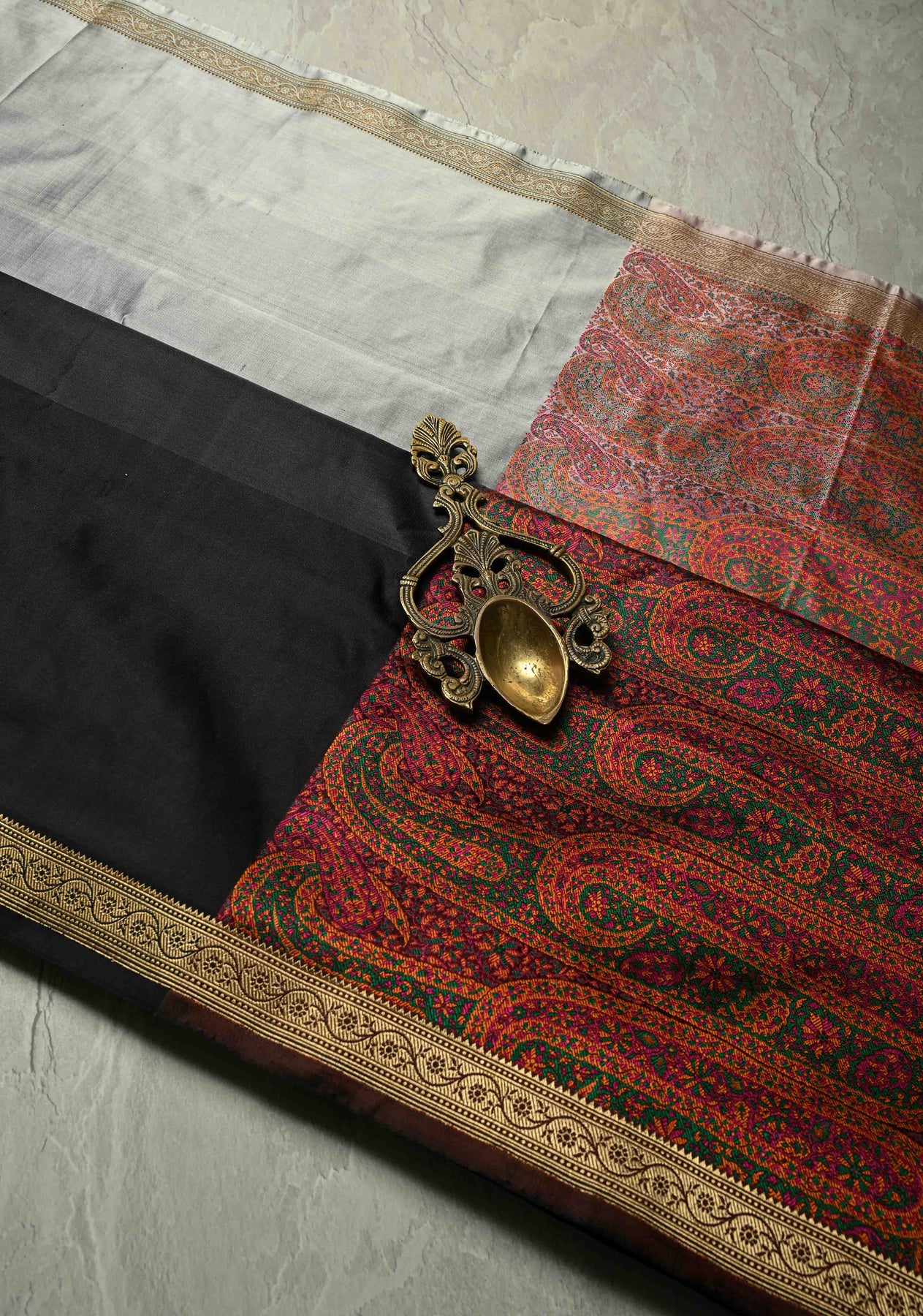 The dramatic black-to-gray ombre effect creates a modern, artistic look, while the intricately woven Tanchoi pallu adds a touch of classic Banarasi elegance. Perfect for cocktail events, evening celebrations, and contemporary ethnic styling, this saree is a true fusion of traditional weaving and modern aesthetics.