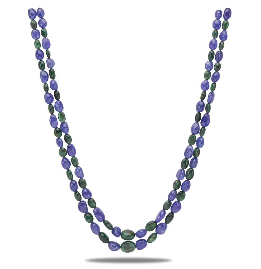 Add a touch of regal charm with our Natural Emerald & Tanzanite Necklace, featuring a stunning blend of green and blue tumble beads. Crafted with AA quality stones, this elegant design showcases 2 rows of natural gemstones, totaling approximately 550 carats and measuring 18 inches in length.