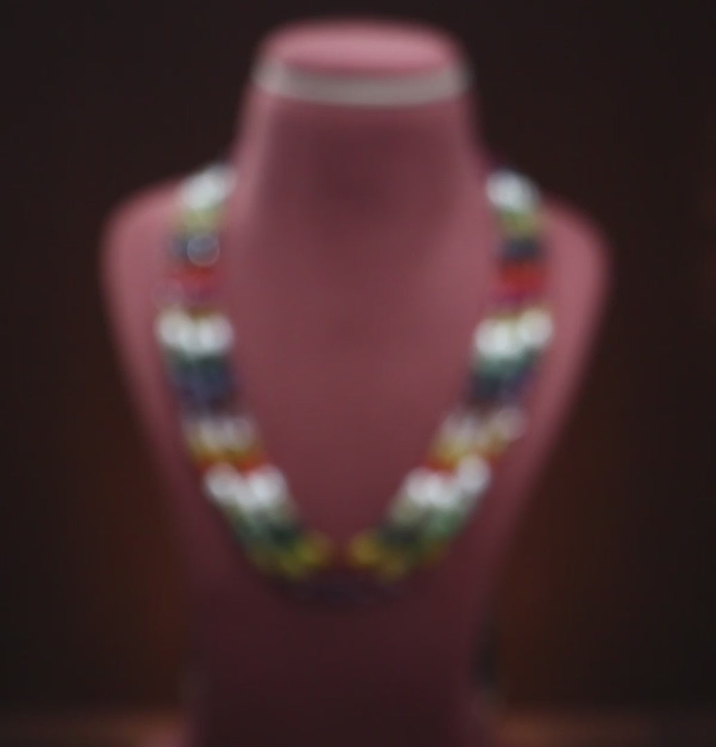 Celebrate tradition and color with our Natural Navratna Necklace , crafted using vibrant multicolor tumble beads representing the nine celestial gemstones. Comprising 3 rows of AA quality stones, this stunning necklace weighs approximately 713.5 carats and measures 18 inches in length, making it both spiritually significant and visually captivating.