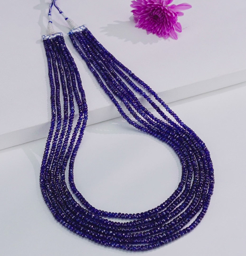 Elevate your style with our Natural Blue Sapphire Necklace, crafted with precision-cut faceted blue sapphires of AA quality. This design showcases 6 elegant rows of radiant stones, totaling an impressive 620 carats and measuring 18 inches in length. The deep blue tones add a royal charm, making it a true statement piece.