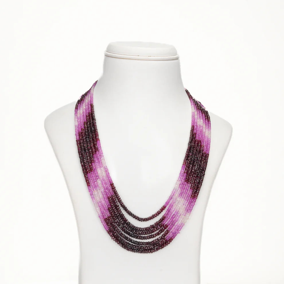 Introducing our exquisite Natural Ruby Necklace a luxurious piece featuring 5 rows of faceted cut natural rubies in a vibrant red hue, totaling approximately 373 carats. Graded AA quality, these meticulously cut stones are strung to form an elegant 18-inch necklace, making a bold yet graceful statement.