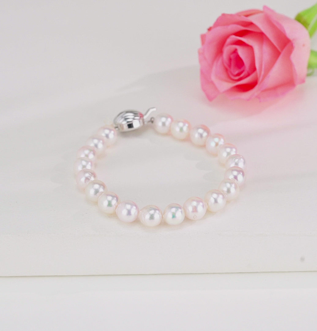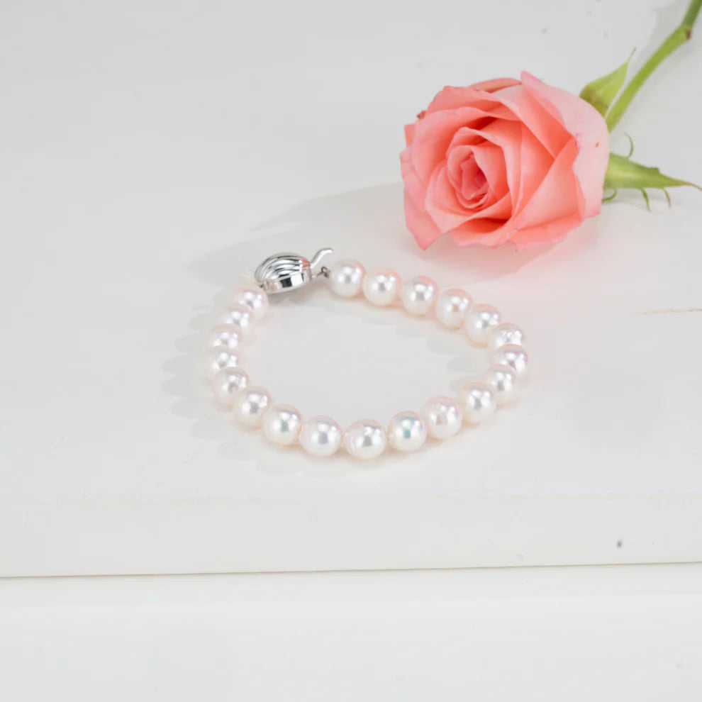 The 8.0–9.0 mm White Round Akoya Pearl Bracelet is a timeless piece crafted from A-quality saltwater cultured Akoya pearls. Each pearl is perfectly round with a radiant white luster, reflecting exceptional quality and elegance. Designed in a single row, the bracelet measures 7 inches in length for a comfortable and graceful fit. With an approximate pearl weight of 89.250 Ct, it offers a luxurious feel while remaining refined and versatile. Ideal for both everyday wear and special occasions, this bracelet is backed by a lifetime guarantee on pearls, ensuring lasting beauty and value