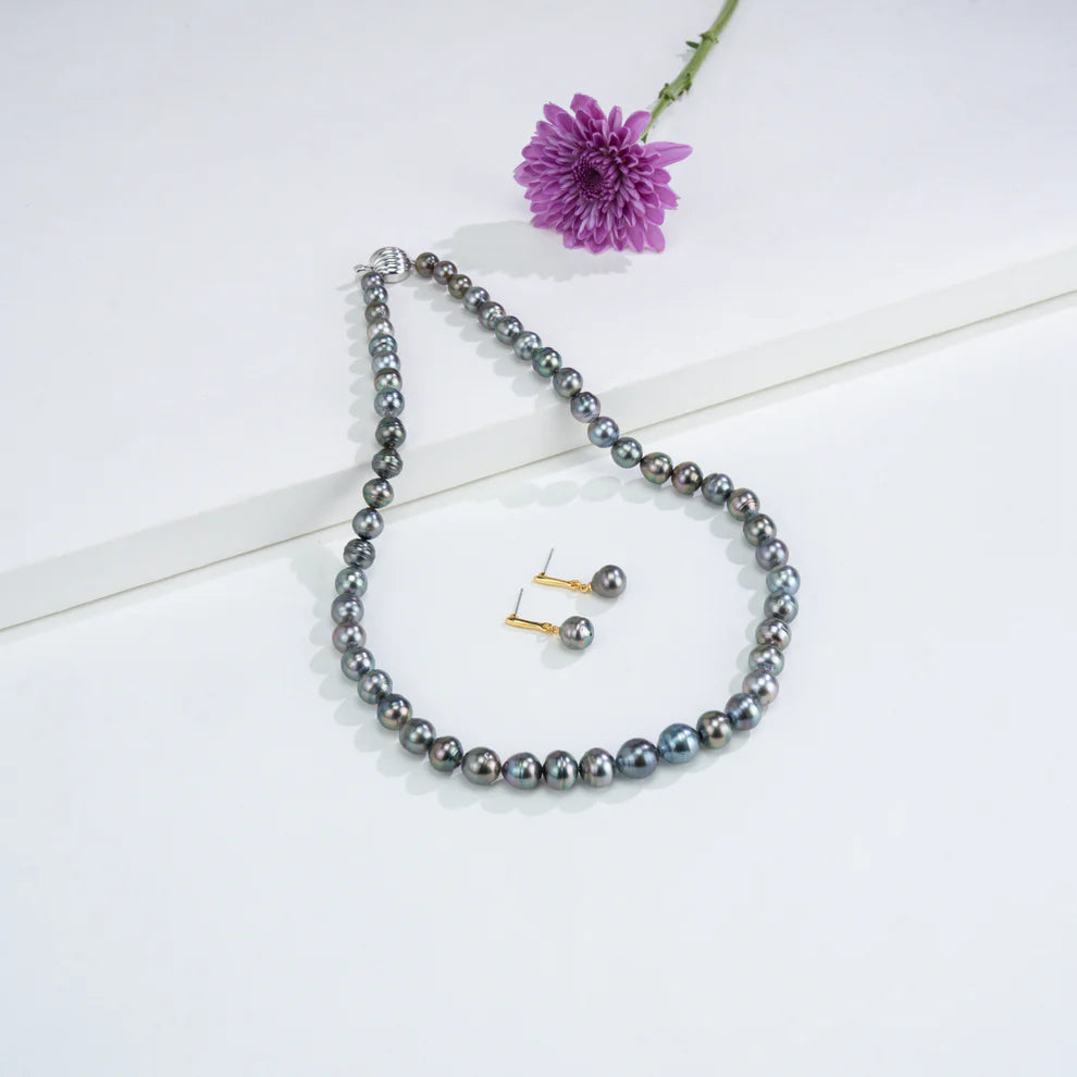 Regular price $1,825.20 Save $-1,825.20Experience bold elegance with this stunning Black Tahitian Ringed Pearl Necklace Set, crafted from premium saltwater cultured South Sea pearls. Featuring near-round pearls with natural ringed texture, this single-row design offers a unique and sophisticated appeal. The deep black color adds a luxurious and modern touch, perfect for special occasions and statement styling. Measuring 18 inches in length, the necklace sits gracefully on the neckline, providing comfort and elegance. With an approximate pearl weight of 276.80 carats and AA quality finish, it ensures lasting beauty and durability. Each piece comes with a lifelong pearl guarantee and a Certificate of Authenticity, confirming 100% genuine pearls.